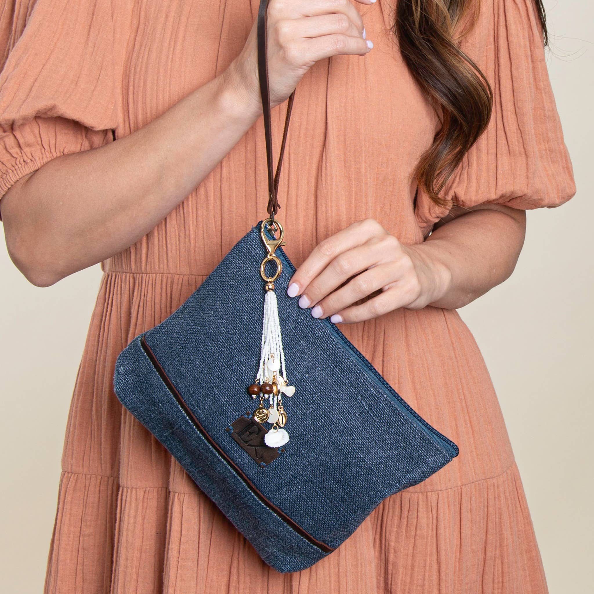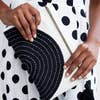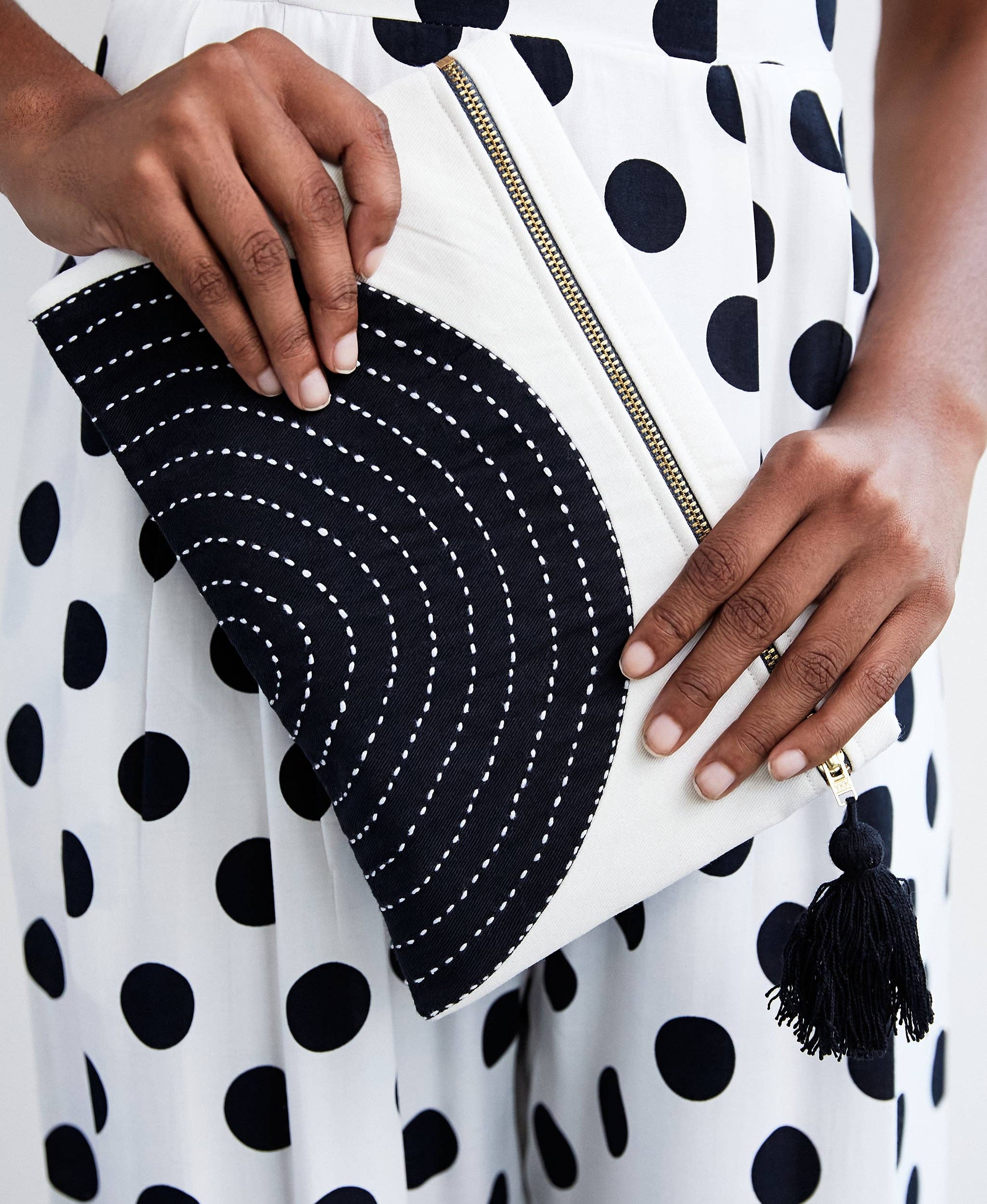 This small pouch showcases charming black-and-white cross-stitch embroidery, a handcrafted tassel zipper pull, and a durable canvas lining. Perfectly sized to hold your essentials, it doubles as a stylish clutch to complete your outfit. Product Details: • Size: 7”H x 10”W • Materials: 1 layer of 100% organic cotton twill, canvas-lined interior, lead-free YKK gold-tone metal zipper closure • Dyed with non-toxic & low-impact AZO-free dyes • Handcrafted by a skilled woman artisan in Ajmer, India • Features the hand-stitched signature of the maker on the tag