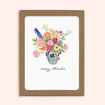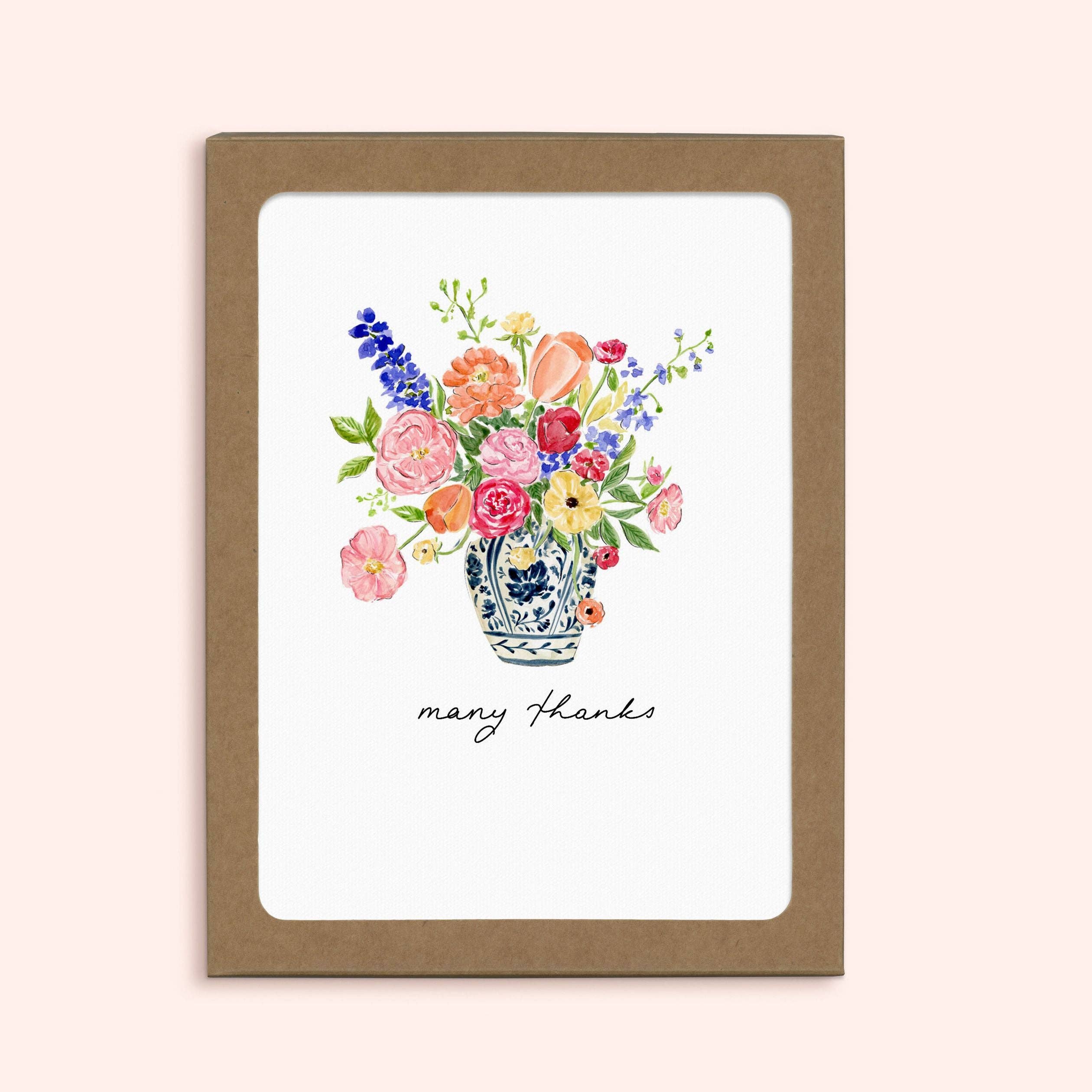 Hydrangea garden thank you card. "Thank you so much" Boxes of 8: packaged in an eco-friendly kraft branded box with open window. no plastic on the window. All cards are A2, 4.25 x 5.5 & blank inside. Printed in the U.S. on 100% recycled FSC paper. Envelopes are kraft, 100% recycled. Boxes of 8: kraft box with label. Hand illustrations by Cindy LaColla. @cynlastudio