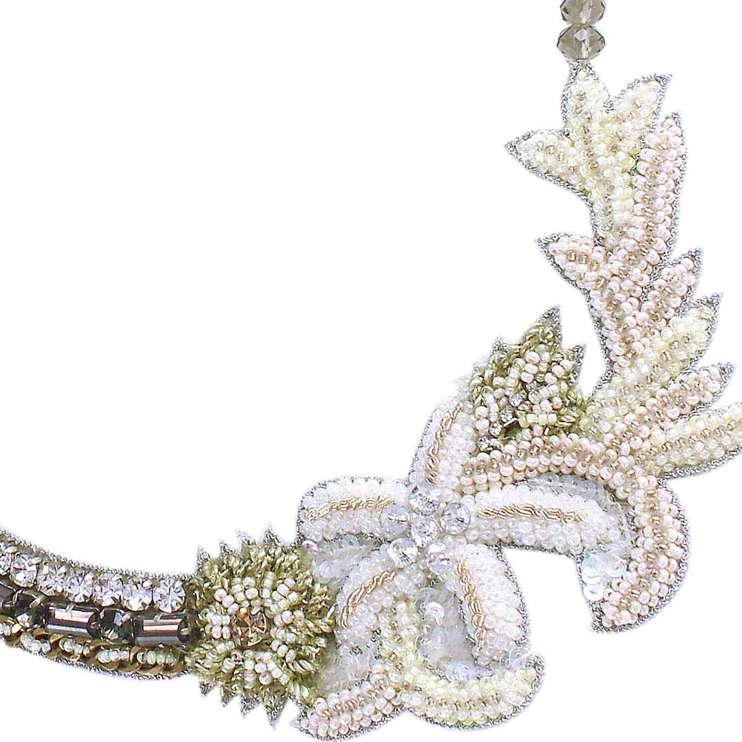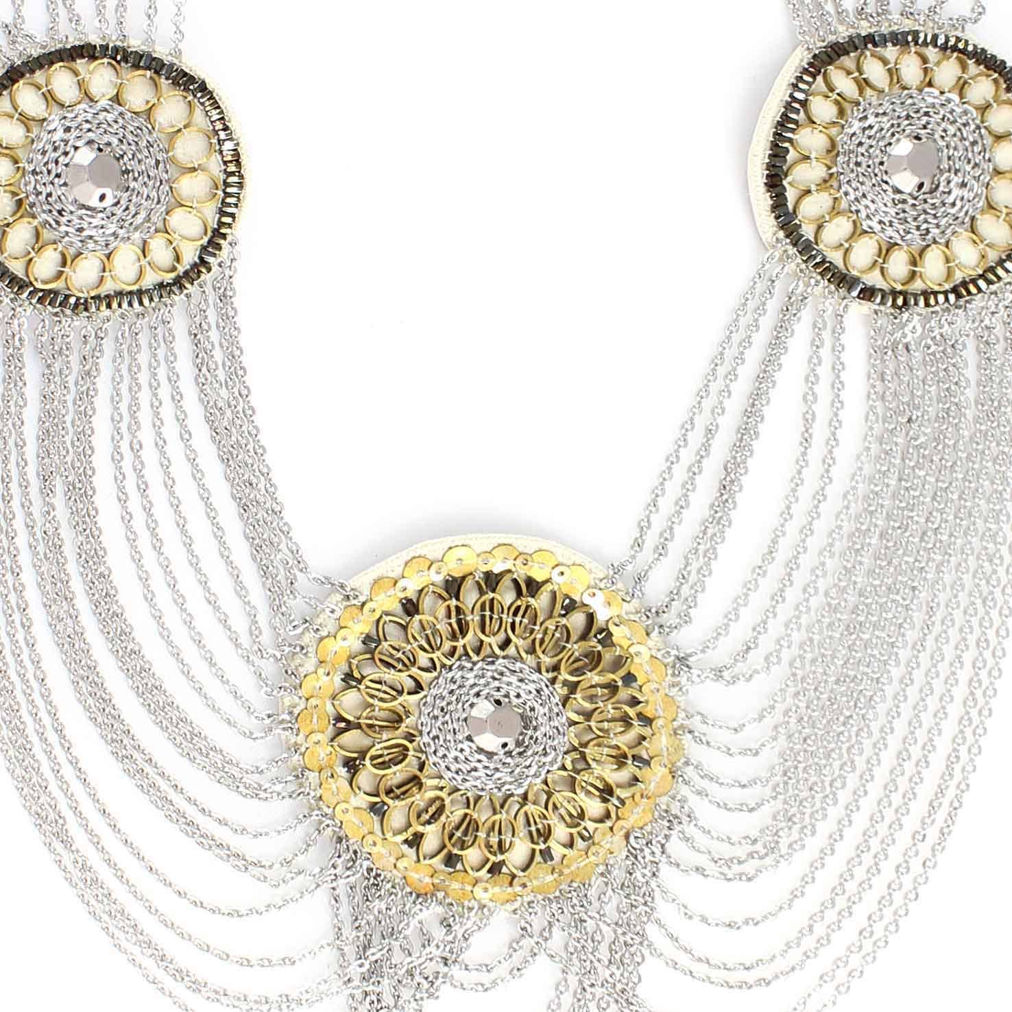 Our wonderland topaz necklace is a statement piece that features a beautiful topaz centerpiece adorned with a cascading rhinestone tassel accent. Pink, peach, gold and green stones forming geometric patterns connect the centerpiece to a 3-strand chain. Lobster closure with extention. 16" l (2.5 extension) / medallion + tassel: 4"L x 1.75"W/.