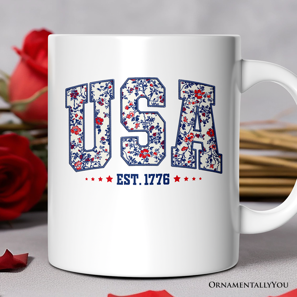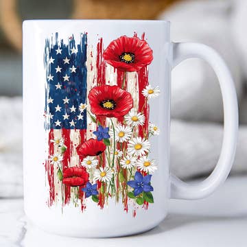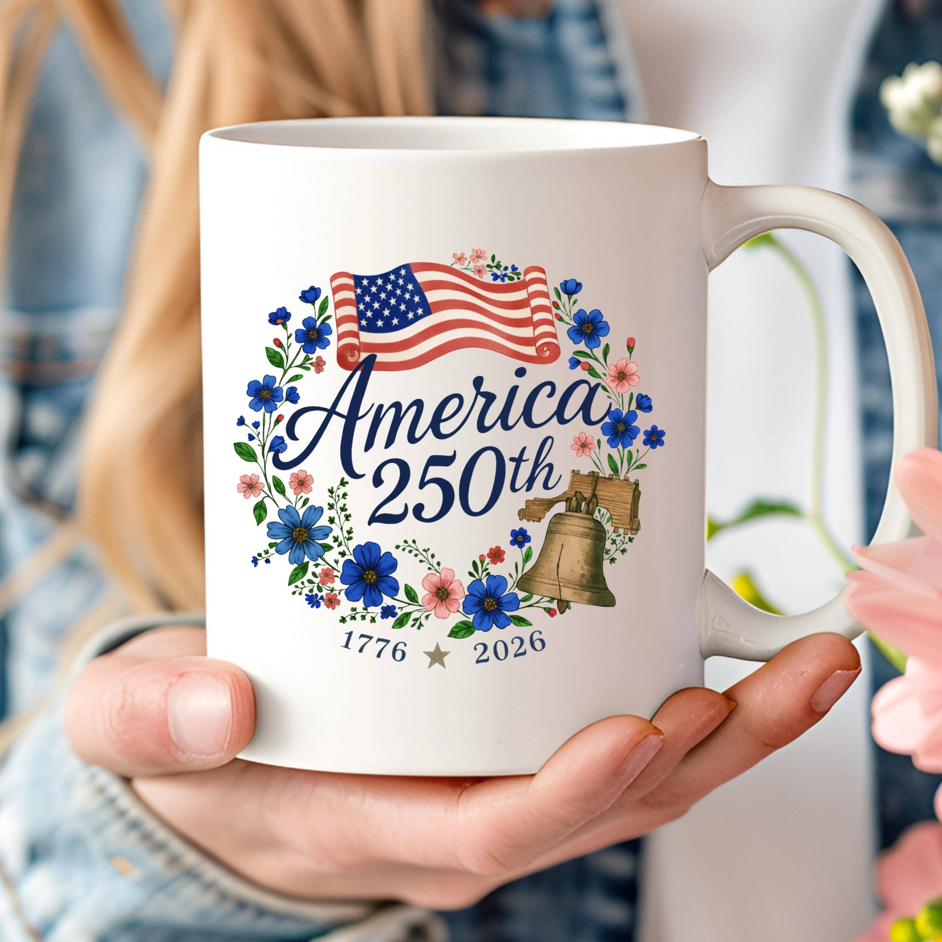 Celebrate America’s 250th anniversary with this charming Freedom250® ceramic mug, featuring a hand-painted tote of blue hydrangeas topped with crossed patriotic flags marked “250.” Officially licensed, fresh, festive, and classically American, this design blends coastal garden style with timeless patriotic charm. Perfect for July 4th displays, Americana gifting, summer hosting, and commemorative collections, this mug appeals to customers seeking meaningful, design-forward pieces for everyday use or special celebrations. The soft watercolor palette and preppy floral motif make it equally at home in coastal, New England, and traditional retail settings. A standout item for 2026 America's 250th birthday merchandising, Memorial Day, Independence Day, and year-round patriotic storytelling. Perfect for coffee, tea and hot chocolate, our 15 oz. premium ceramic mug features a large comfortable handle for easy gripping. It'll quickly become a favorite! + Dishwasher and microwave safe + Printed in the USA