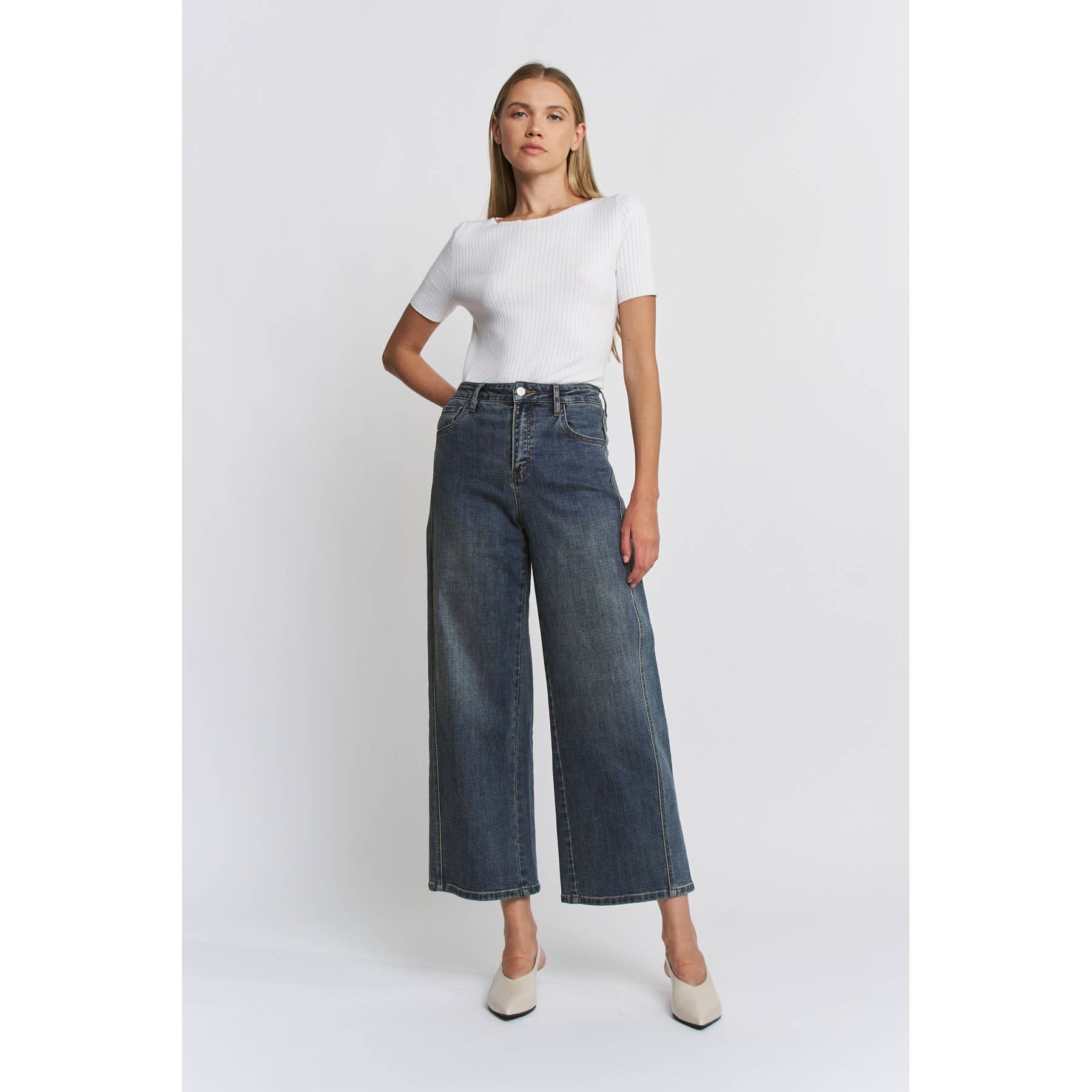 HIGH RISE SEAMED WIDE LEG ANKLE 76% COTTON, 22% POLY, 2% SPAN FRONT RISE: 11 1/4" INSEAM: 28" LEG OPENING: 22"
