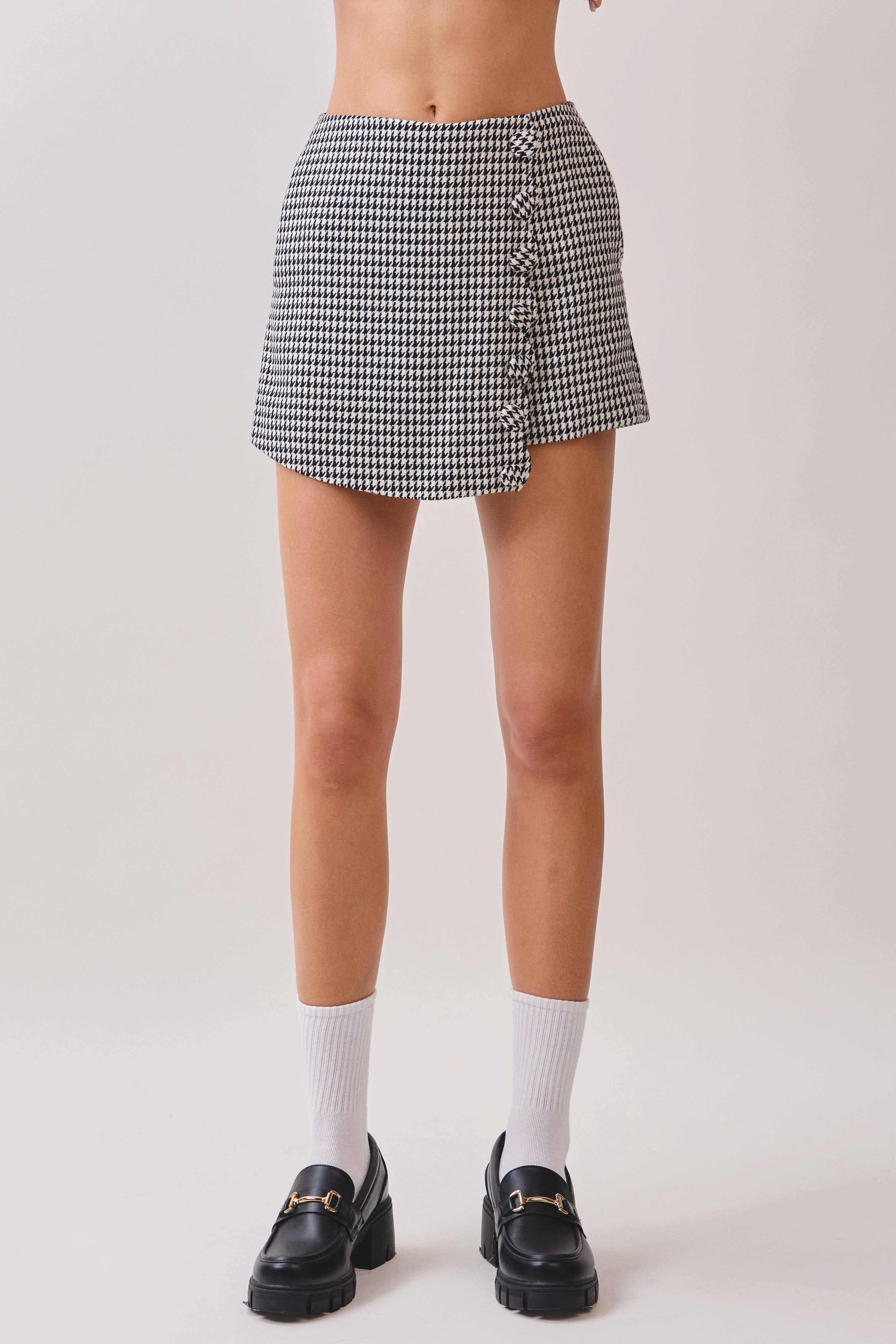 The pleated plaid skort with side buttons combines the classic charm of a pleated skirt with the comfort of built-in shorts. Featuring a timeless plaid pattern, it offers a preppy and stylish look, perfect for casual outings or chic streetwear. The side button details add a refined touch while ensuring a secure fit. Designed for versatility, this skort pairs effortlessly with fitted tops, oversized sweaters, or blazers for a trendy yet comfortable ensemble. Ideal for everyday wear, it blends fashion and functionality seamlessly. -Model is 5'9" and wearing a Small