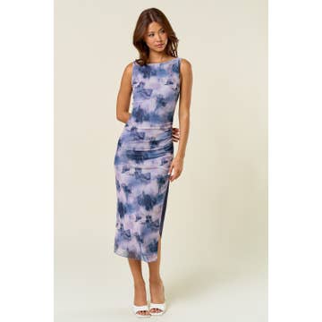 - Short Sleeve - Printed - Mesh Detail - Square Neck - Midi Length - 95% Polyester, 5% Spandex - Imported. Designed in USA.