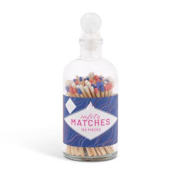 Mini Apothecary Vintage Light Pink Matches bring charm and function to your space with their vintage design and convenient size. Housed in a stylish apothecary-style glass jar, they offer both beauty and practicality. Their nostalgic look makes them perfect for display on coffee tables, in bathrooms, or alongside your favorite candles. They also make a thoughtful addition to gift boxes and hostess gifts. Designed for ease of use, these matches light effortlessly and provide a reliable flame for candles, fireplaces, or incense. The compact jar makes them easy to take on the go—perfect for beach trips, tailgating, or camping. Both decorative and functional, these matches add a touch of vintage charm wherever you take them. 4" high x 2" wide jar Approx. 65 matchsticks at 3" tall Cork top Vintage style label with striker LTP301