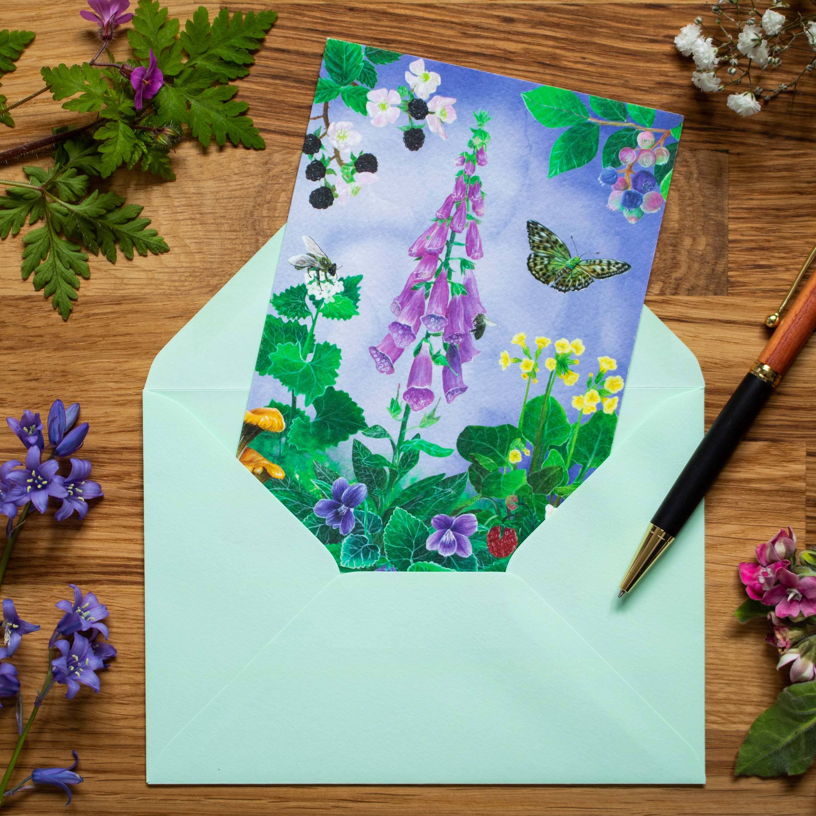 Bold red Poppies grow in from the side on this printed greeting card, surrounded by lady's mantle, pink Columbines and a bright peacock butterfly. This printed garden floral card is part of the 'My Mother's Garden' collection. A light green watercolour background with a fern texture creates a fresh spring like background for the design. The card comes with a complementing grass green envelope. The inside of the card is blank. - Material: 250 gsm Tintoretto Gesso Paper with light texture - Dimensions: A6 (10.5 x 14.85 cm) card / C6 (11.4 x 16.2 cm) envelop - Packaging: compostable and biodegradable cello bag The bright red Poppies, peacock butterfly and other garden flowers and greenery all originally have been hand-painted. The card has been digitally printed which allows the painterly characteristics of the design to shine through. You can find more designs within the 'My Mother's Garden' collection including stone tile coasters, aprons, oven gloves and more.