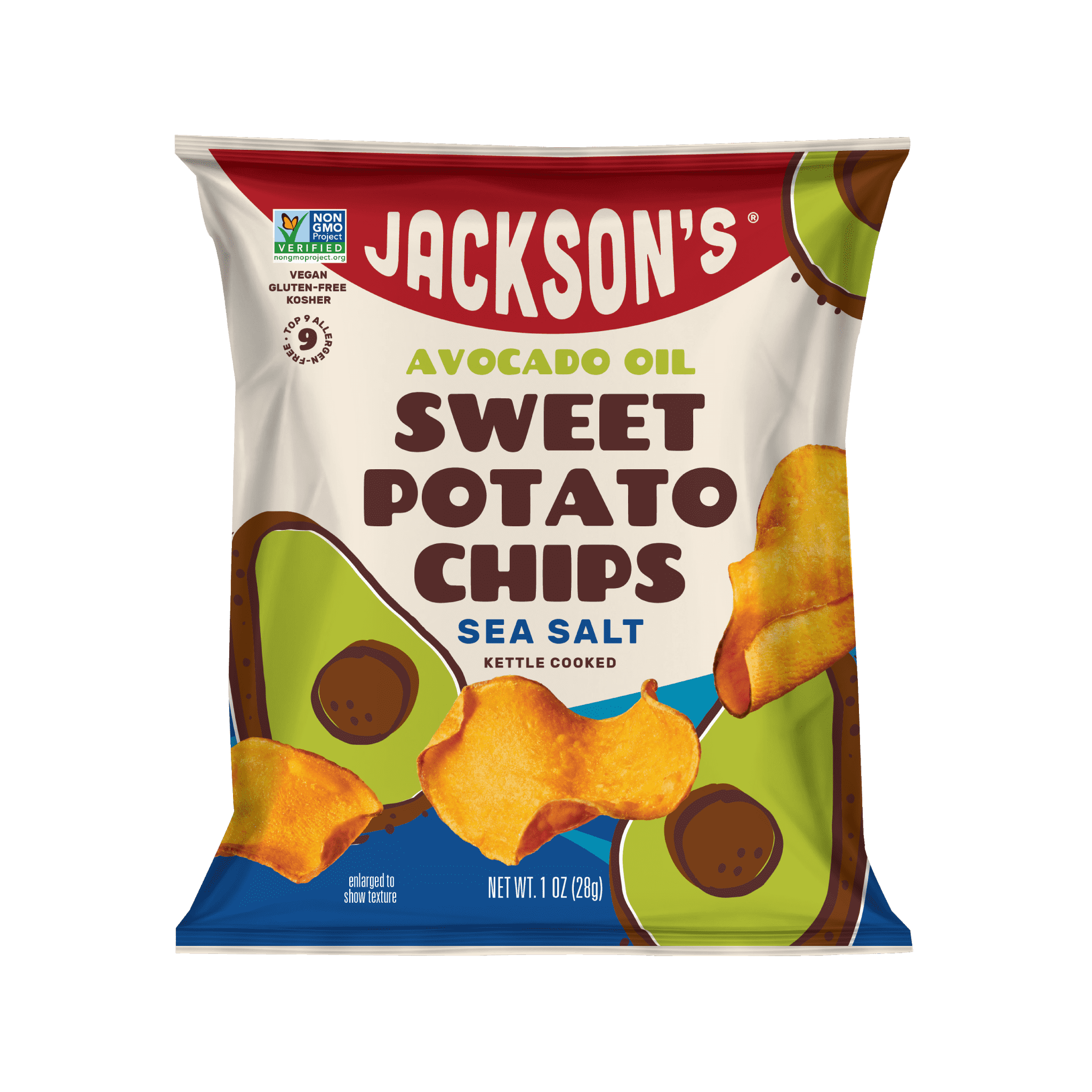 Just three super ingredients make up these savory and satisfying chips. We take non-GMO sweet potatoes, kettle cook them in avocado oil and give them a toss of sea salt to bring out their superior flavor. Hero your lunchtime, anytime snacking today! Beware of Imi-Taters At Jackson's, we've mastered the art of crafting snacks with premium avocado oil, a better-for-you fat that puts other oils to shame. While other snack brands settle for cheap seed oils, we never compromise on quality. We even go the extra mile to rigorously third-party test our suppliers. Our commitment to uncompromising standards sets us apart from the Imi-Taters who miss the mark on delivering truly heroic ingredients. A savory sensation We believe that snacking should be a joy, not a source of stress or compromise. Our mouthwatering snacks are crafted to satisfy your cravings while being friendly to nearly every diet imaginable. Gluten-free? Check. Vegan? Check. Free from the top 9 allergens? You bet! With Jackson's, you can embrace the joy of snacking without ever having to check the label twice.