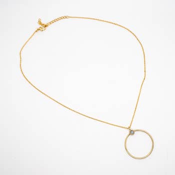 Material: Gold filled Length: 15" chain with a 1.5" extender Charm: 1" gold filled ring Made by hand in Southern California