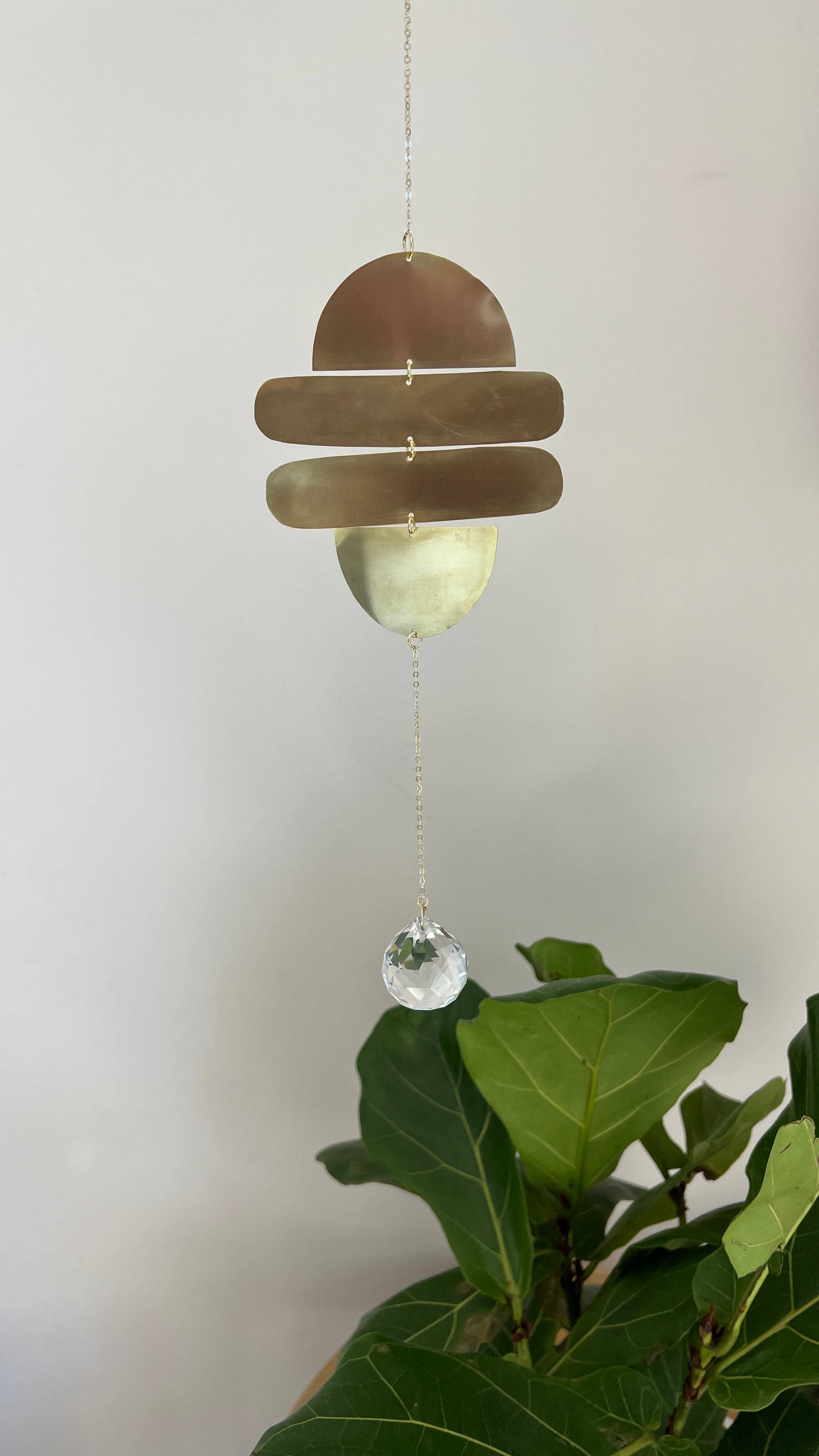 The Large Ginkgo Leaf Sun catcher Created from a beautifully crafted brass pieces and held together with 24k gold plated chain and jump rings. This piece is modern and understated, it works great in any room and is there perfect fit for a small window. Crystal size is 30mm Total length is 14 inches with the crystal When direct sunlight hits the crystal its bounces little rainbows all over the room. Add a suction cup to your window, a c hook to your ceiling with wire to adjust the height or add a hook to your curtain rod. A unique gift for anyone in your life!
