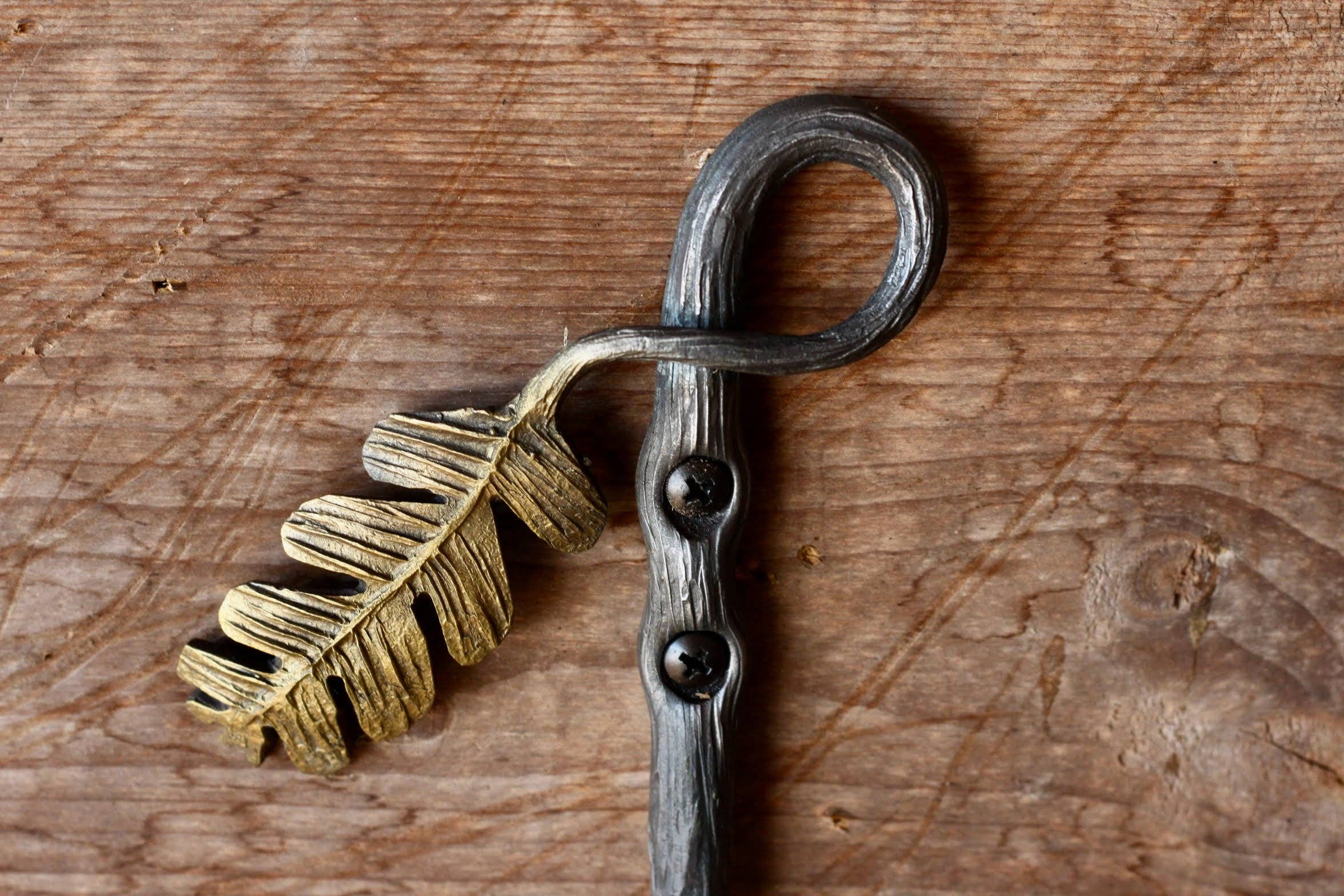 Bring a touch of nature into your home with these hand-forged leaf hooks. Each hook has a right facing leaf and is made using traditional blacksmithing techniques, where steel is heated, hammered on an anvil, and shaped while red hot. The hooks are made of ⅜" (10 mm) material and are approximately 6" (150 mm) tall x 5" (125 mm) wide. They protrude from the wall 2" (50 mm) and come with two screw holes for attachment.