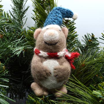 A chubby little mouse all decked out for the winter with a knitted scarf and hat. Cute and fun! Materials: 100% wool felt with knitted wool accessories and cotton string for hanging Height: 5.5 inches Handmade in Nepal: may contain slight variations Handmade in Nepal: may contain slight variations