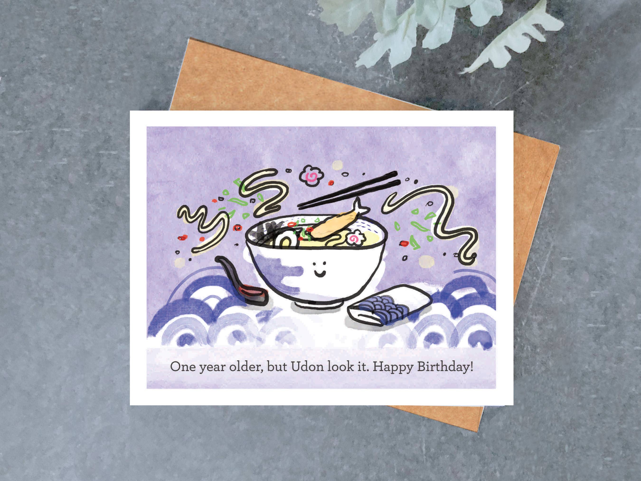 Dim Sum-body say...dim sum? This punny birthday card is a sure hit for Asian food-lovers everywhere. Chopsticks not included. - A2 size (4-1/4"x 5-1/2" when folded) - Blank inside - Offset printed in Toronto on natural-white, heavyweight, textured paper - Die-cut with rounded corners - Matching envelope included SKU: 1597