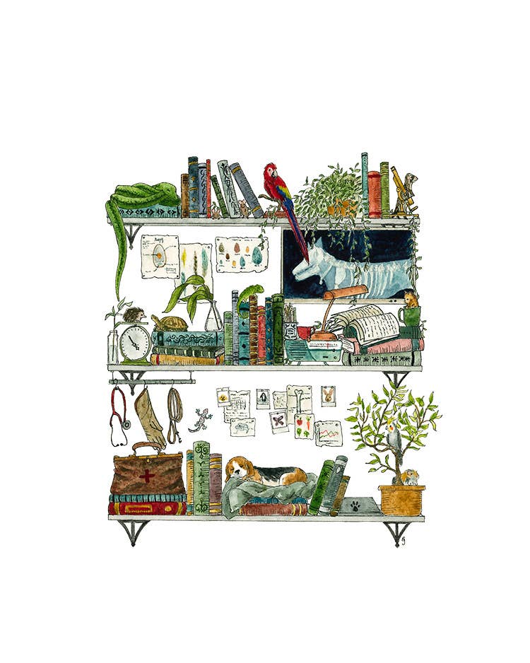 Postcard featuring my original watercolor and ink illustration of the vintage oddities and books tucked away in the shelves of a biologist. A goldfish, canaries, a vintage radio, and pictures of Sasquatch and Nessie are just a few of the details you'll find hidden in this painting! -Printed on high quality card stock -Each postcard measures 4.25 x 5.5" (A2)