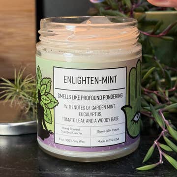 Our hand poured Cucumber Mint soy candle scent is super fresh and minty which sums up this lovely scent. Imagine a fresh sliced cucumber and mint snipped from your garden. We have added dried parsley and peppermint to the soy wax for some color. Product Highlights: Size: 8 oz. square metal tin with clear lid Approximate burn time 40 hours Each candle is hand poured in the USA! Ingredients: 100% American soy wax, lead free all cotton wick, phthalate- free fragrance oil and dried herbs. Soy wax has a great scent throw, clean burning, sustainable, burns longer, vegan and is biodegradable. Made in Michigan Suggested Tags - Summer Garden, Vegetable, Mint, Clean, Soy Wax Candle, Florist, Summer