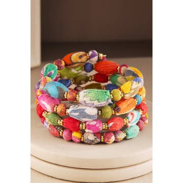 Hand-selected Kantha textile beads create a soft rainbow gradient in this wrap-around bracelet, finished with brass charms. • Measures 1" wide. • Sustainably handmade from repurposed cotton Sari & Kantha textiles by women artisans in India. • Colors & patterns will vary due to repurposed textiles.
