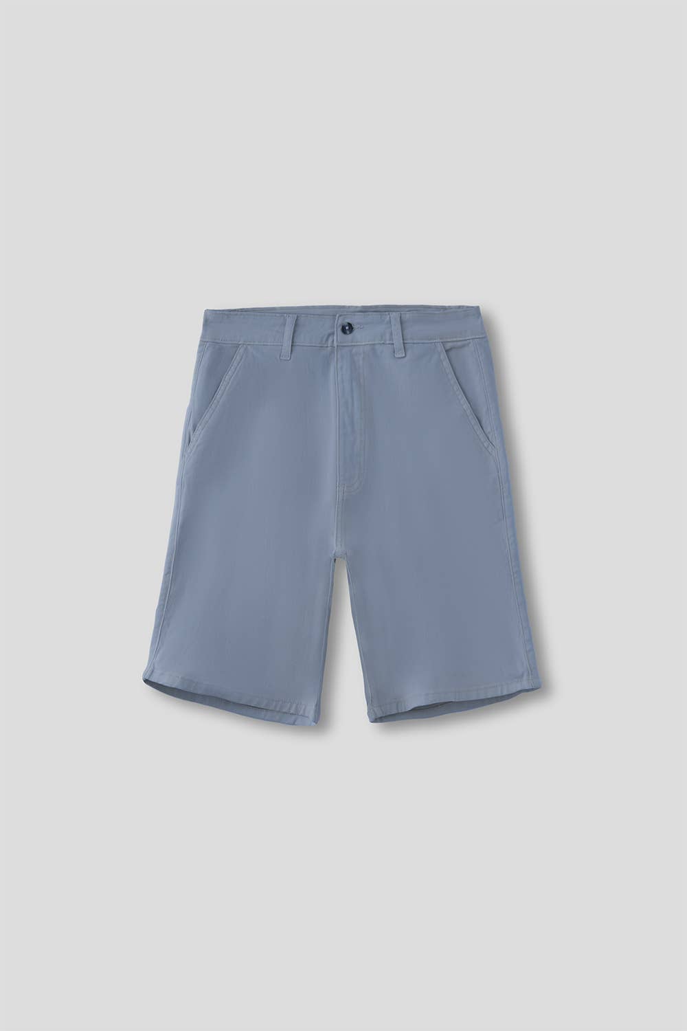 Denim-style Bermuda shorts with five pockets. Central closure with button and zipper, customized hardware, and faux leather effect label on the waistband. Various colors.