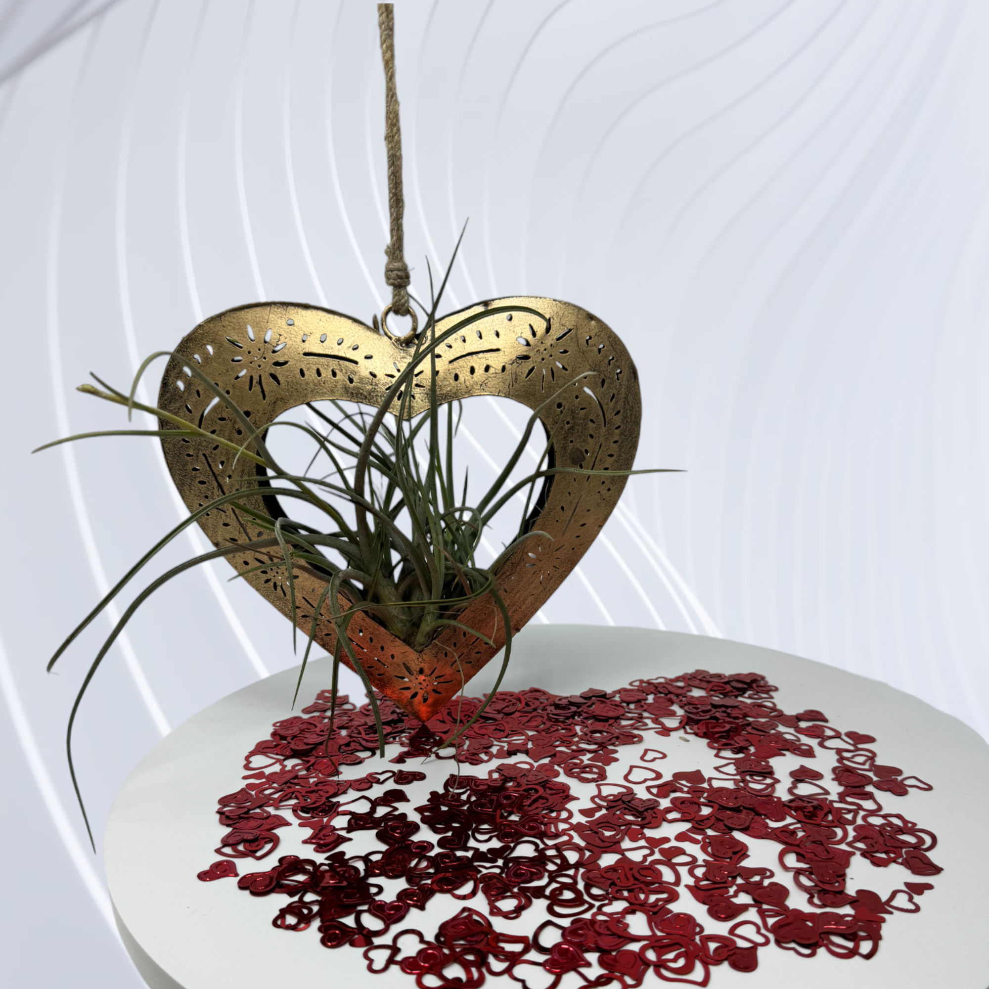 Six Piece Heart Bell Chime Pendant on Jute Rope available in two finishes. Burnished Gold or Fire Engine Red. Each bell is handmade and has a metal tube clapper. Great for Valentine's Day, Mother's Day and any Special Occasions. Bells can easily be separated to be used in floral arrangements. Perfect for St. Valentine's Day, Mother's Day, Birthdays, Anniversaries, Baptisms, Weddings, Confirmations and Quinceaneras. RIBBON NOT INCLUDED WITH PRODUCT