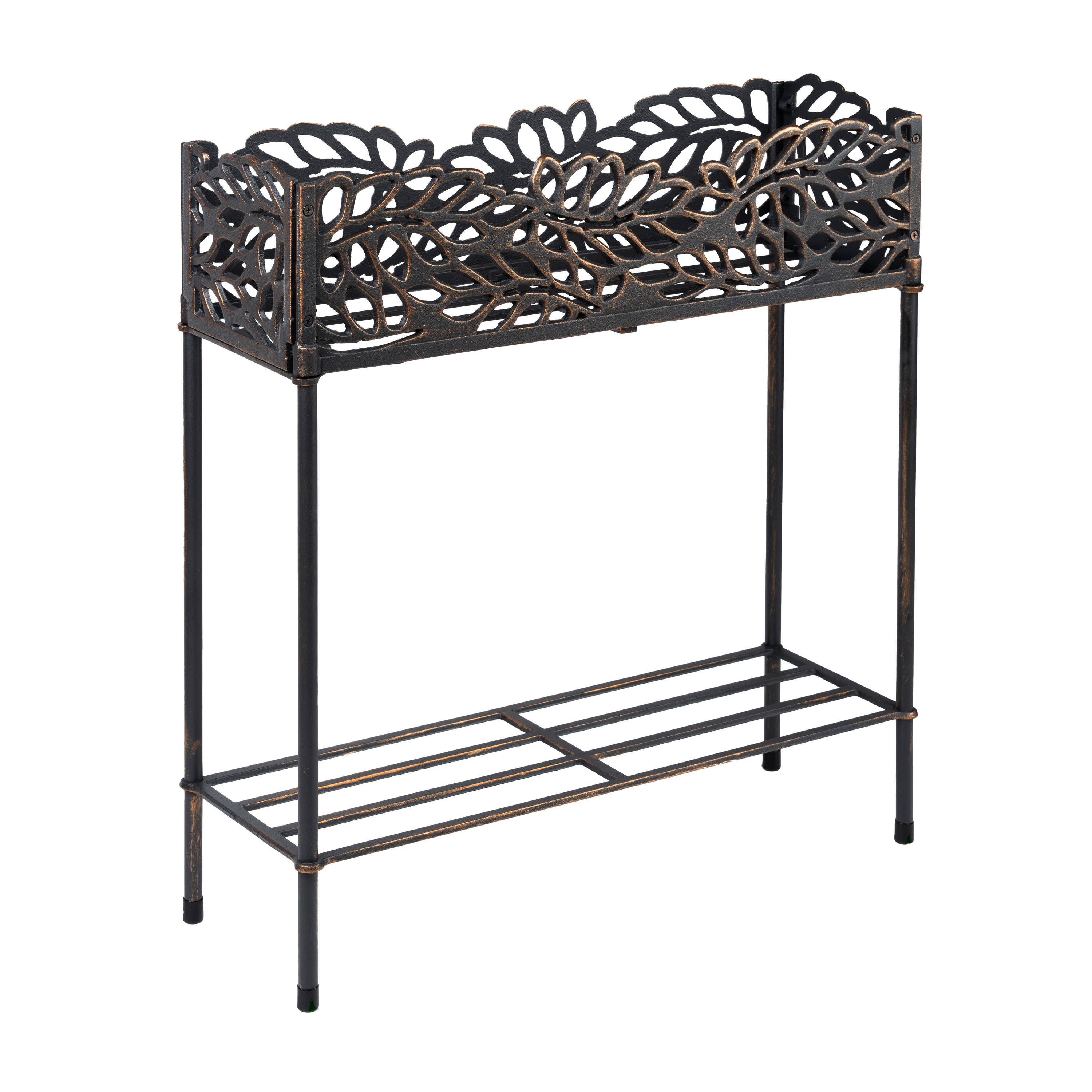 This backless bench is perhaps our most versatile item. Outdoors, it works equally well as a bench or coffee table. Bring it indoors and pair it with the Flora wall art, and you have a great place to take off your shoes and hang up your coat. Adjustable rubber feet won’t mar floor surfaces. Tube steel lower shelf. NOTE: The side frames have been redesigned to not include the decorative flora pattern. See photo against white background for accurate visual of product legs. Specifications (fully assembled): 34" wide, 18" tall and 14" deep. Product Weight: 50 lbs. Seat capacity: 500 lbs.