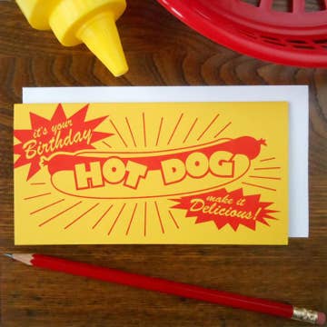 Remember old school drive-in diners & hot dog stands? the kind you visit & your hotdog was put in an amazing glassine bag? they usually had bright colors with classic typography, similar to this card. perfect for any hotdog lover or hotdog in your life! 1 color letterpress printed bright yellow cover stock white envelope blank inside