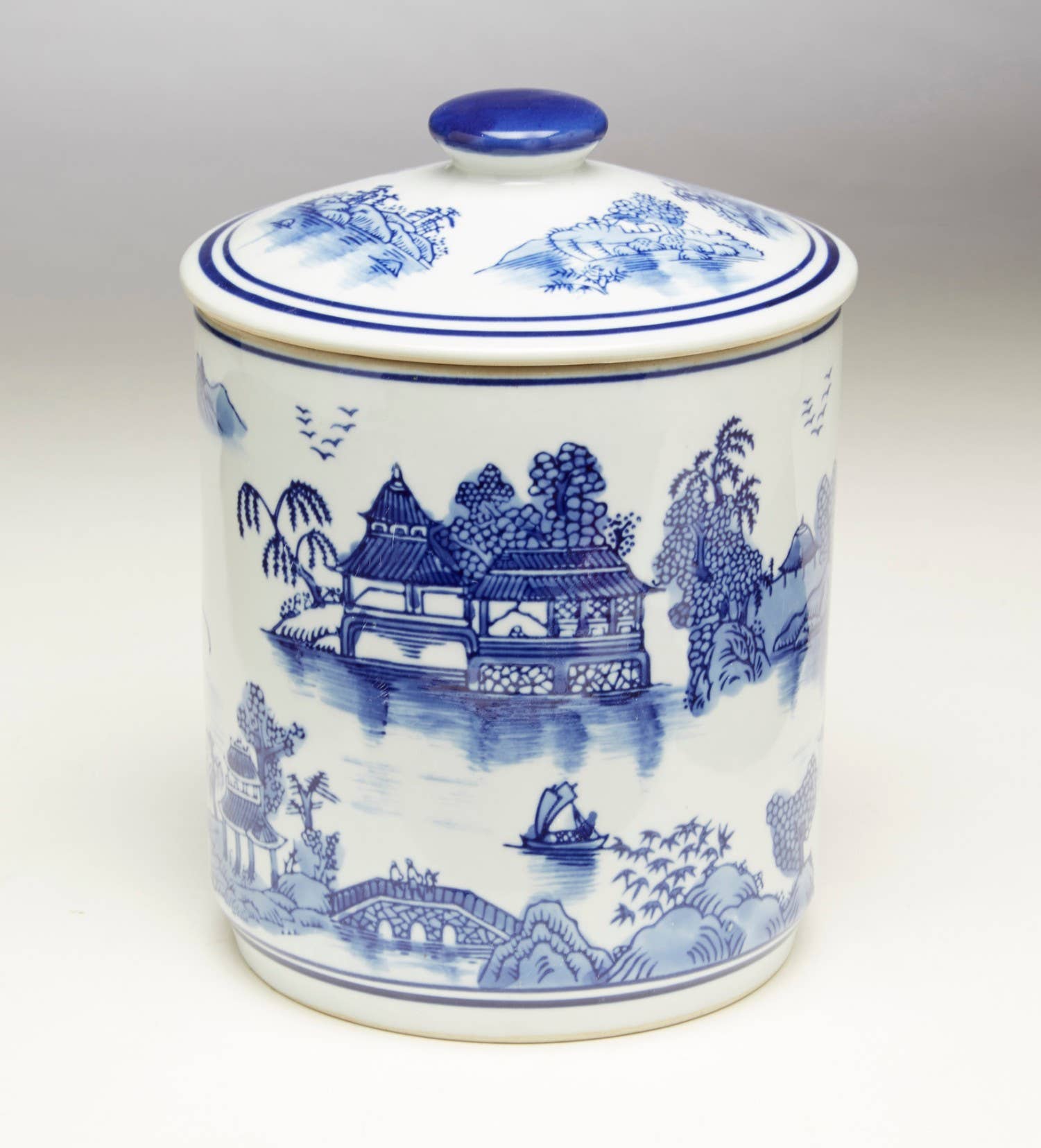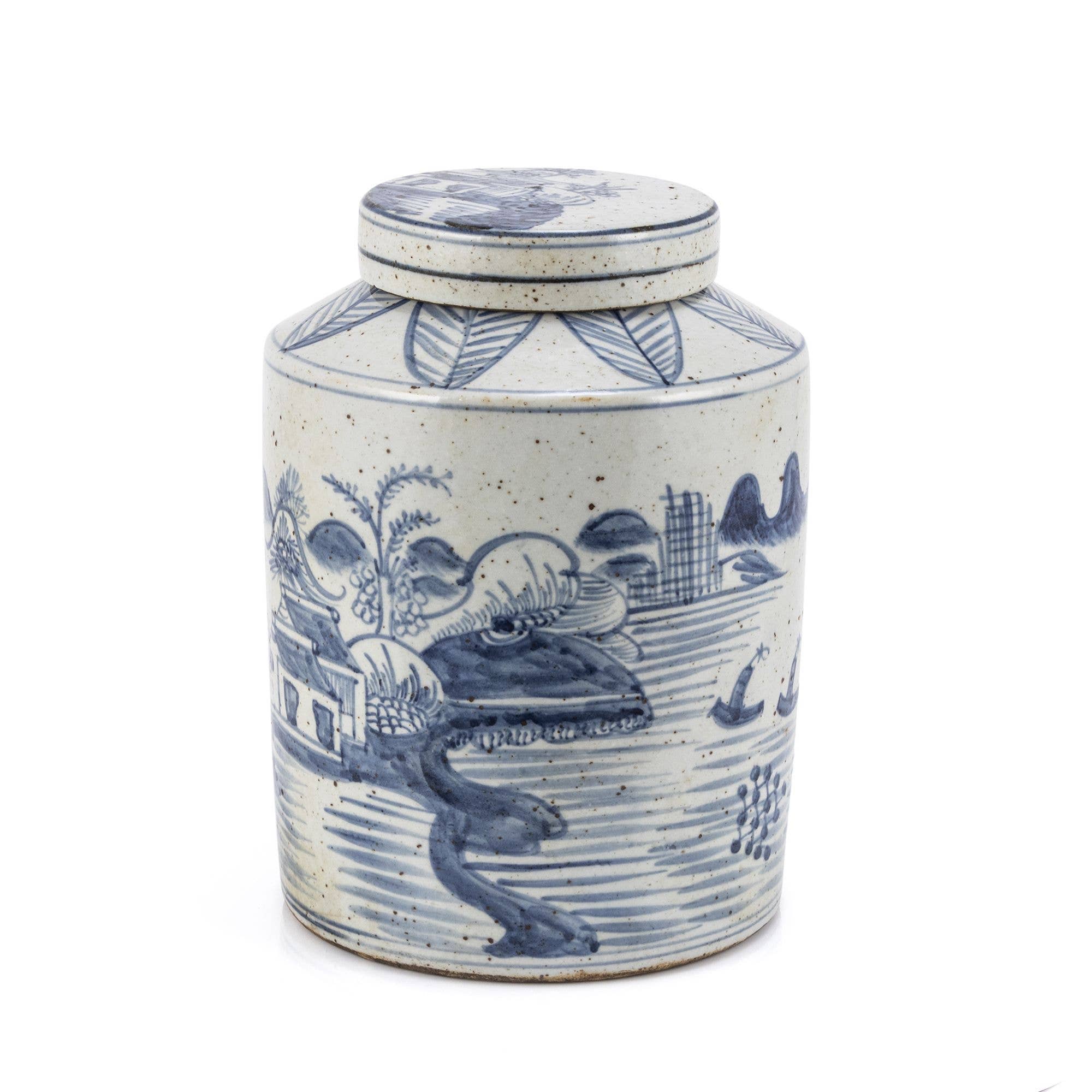 The Blue and White Ancient People Lidded Jar is a beautiful, unique piece for your home. This jar is hand made from highfire porcelain, giving it a special touch. It is hand crafted and hand painted, making each one special. The design is an antique reproduction, adding a classic feel to your decor. Perfect for decorative needs, this jar brings elegance and history to any room. Size: 8.5in x 8.5 in x 14 in (W x D x H)