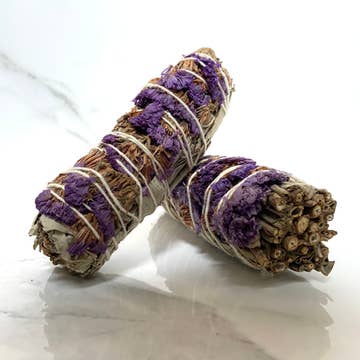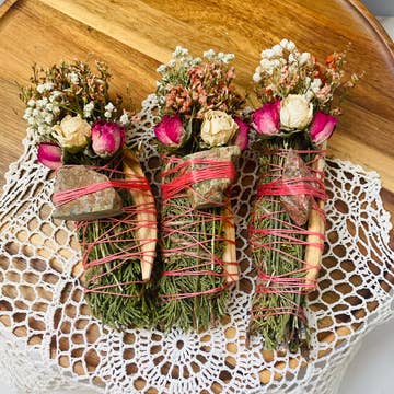 Our Bee's Sneeze Herbal Torches are each hand wrapped using ethically sourced white sage, beeswax, local herbs, flowers and garden greens. Sage wands or “smudge sticks” have been used for thousands of years for spiritual practices of native Americans, greeks and romans. Spiritually, sage is used to expel negative energy, combat stress and bring peace. We include beeswax in our sage wands because burning beeswax produces negative ions which combat allergens, bacteria, dander and mold in the air. Plus they smell great! We have added Black Tourmaline to your torch for added protection and to clear toxicity. Black Tourmaline also promotes a positive mood! Pour Vida’s Bee’s Sneeze Herbal Torches are made to order so please wait until fully dry to ignite. To use: light end on fire. Let burn for 10-20 seconds. Gently blow out and let smoke waft through your well ventilated space, self or item. To extinguish, tap into dirt, sand or fire proof vessel until no longer smoking.
