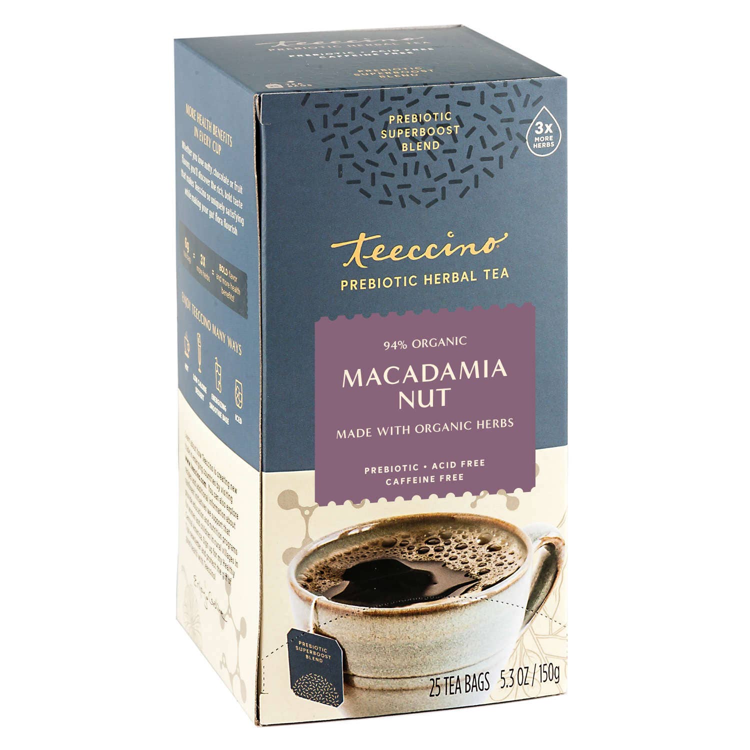 SKU: 40121 Made in United States Diet: Kosher, Organic, and Vegan Shelf life: 24–36 months Storage: Shelf-stable Ingredients: Roasted organic carob, organic barley, organic chicory, organic ramón seeds, organic cinnamon, organic ginger, organic cardamom, organic spice extract, natural vanilla extract and flavor*. *All Teeccino flavors are extracted from plants and comply with organic standards. May contain trace amounts of almonds. Weight: 235.87 g (8.32 oz)