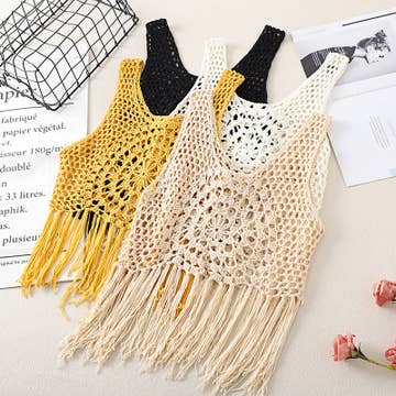- Fringe Detail Oversized Sweater Top - V-neck - Sleeveless - Bright Colors - Summer Sweater - Drop Shoulder - Festival - Crochet - Summer Sweater - Sweater Vest - Sleeveless Crop Sweater - Sweater Coverup - Vacation Crochet Top - Beach-ready Crochet Top - Lightweight Crochet Top For Swimwear - Beach-ready Crochet Top - Chic Crochet Top Swimwear accents (Model height: 5'7", wearing a Small, 2-2-2 Size Ratio)