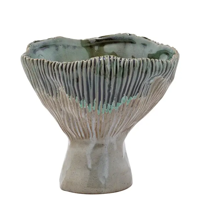 One-of-a-kind porcelain slip cast ruffles vessel. Hand-made individually, pieces will vary slightly but always be beautiful and unique. Fired to cone 10 in a gas kiln which creates variations in color, size, and shape and no two pieces are alike so multiples in a color are not available. They are unique, individual pieces and cannot be reordered as depicted - you can reorder the shape, not the color. There is only one each of a colorway. Each of these is available as one at this time. Dimensions: 10.5" long x 4.5" across with 7" horizontal base. NOTE: Handwash only