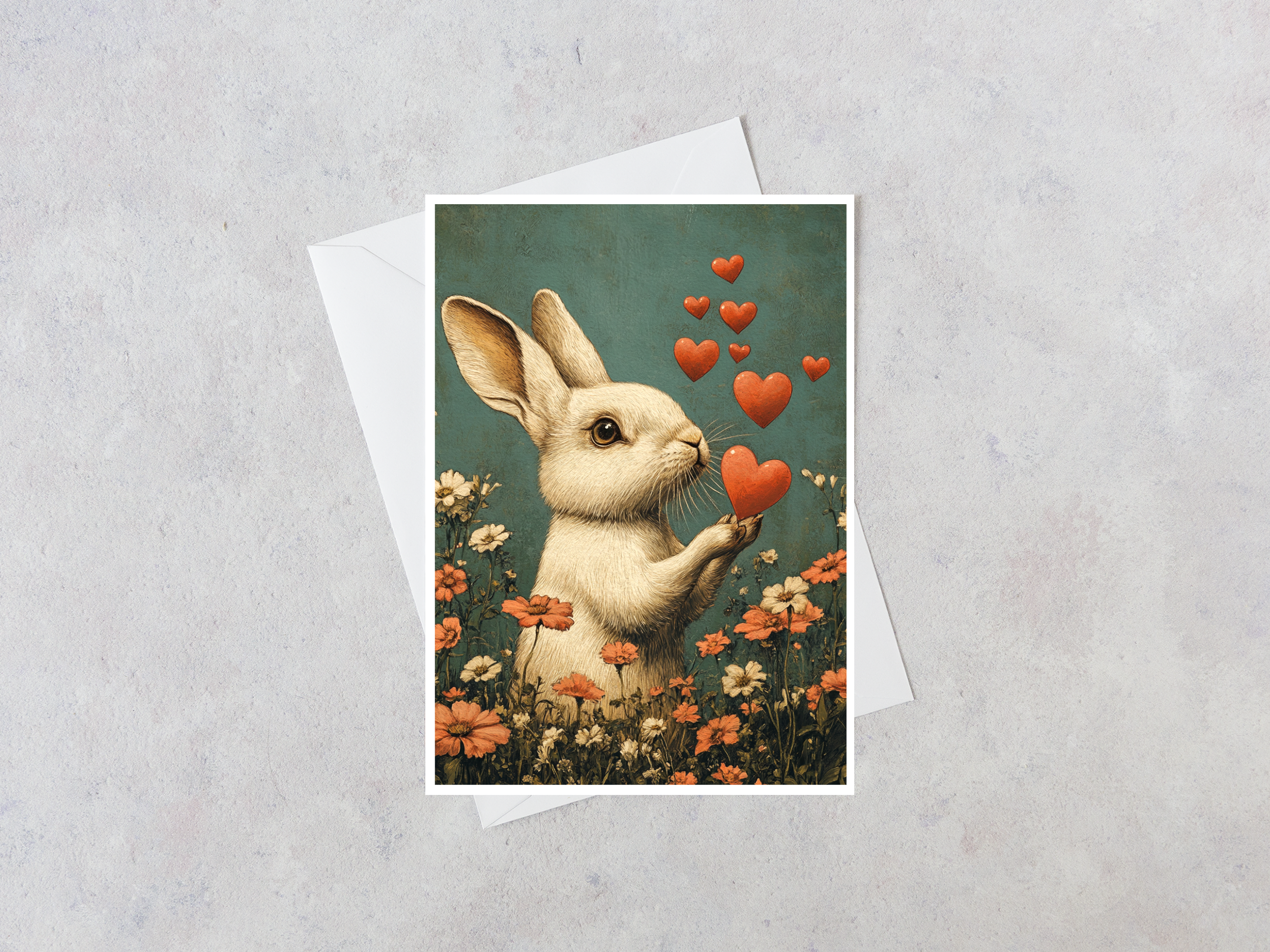 Hand-painted touches of sparkling glitter have been added to accent this love card. "Some Bunny Loves you" is printed on the front of the 5" x 7" card. This card is made in the USA with environmentally-friendly materials. It comes pre-packaged with a white envelope, which requires standard postage to send. The inside is blank, leaving room for a custom message or photograph.