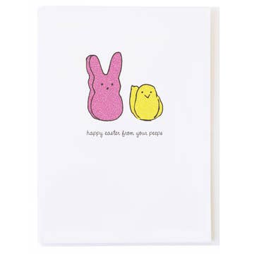 It's the marshmallow candy you either love or hate, and now it's on an Easter card! We're talking about Peeps, the sugar coated gooey candy that is in every kid's basket since they were invented. - A2/ 4.25"x 5.5" / 108 x 140mm - Folded card, blank interior - Printed on recycled cardstock. - Accompanied by a recycled envelope - Packaged in a protective, biodegradable PLA transparent sleeve