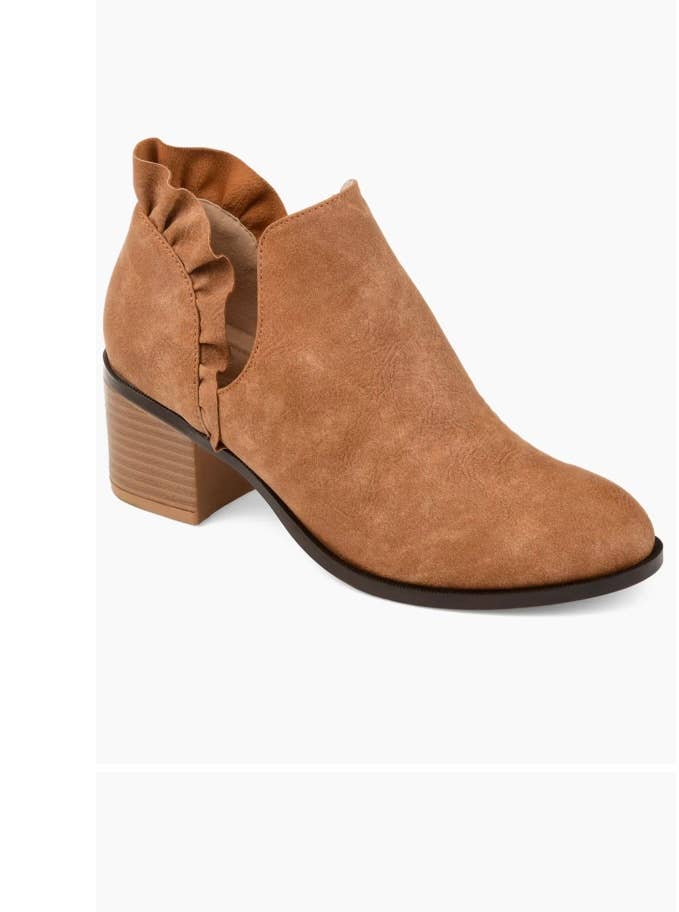 Could this bootie be any cuter? You’ll love this new bootie by Journee Collection. This bootie has it all from faux leather material and a perfect deep v cut-out to ruffle heel accents. The best part about this bootie is that it is part of our comfort line. You’ll get beautiful detail and you’ll be comfortable all day! ♥Heel Height:2 1/4-inch ♥Heel Type: Stacked ♥Platform Height:1/2-inch ♥Shaft Height:2 1/2 inches ♥Top Circumference:11 1/2 inches ♥Shoe Width: Medium ♥Closure Type: Slip-on ♥Toe Style: Almond ♥Lining: Faux Leather ♥Upper Material: Faux Leather ♥Outersole Material: Man-made ♥Footbed: 6 MM Comfort Foam™