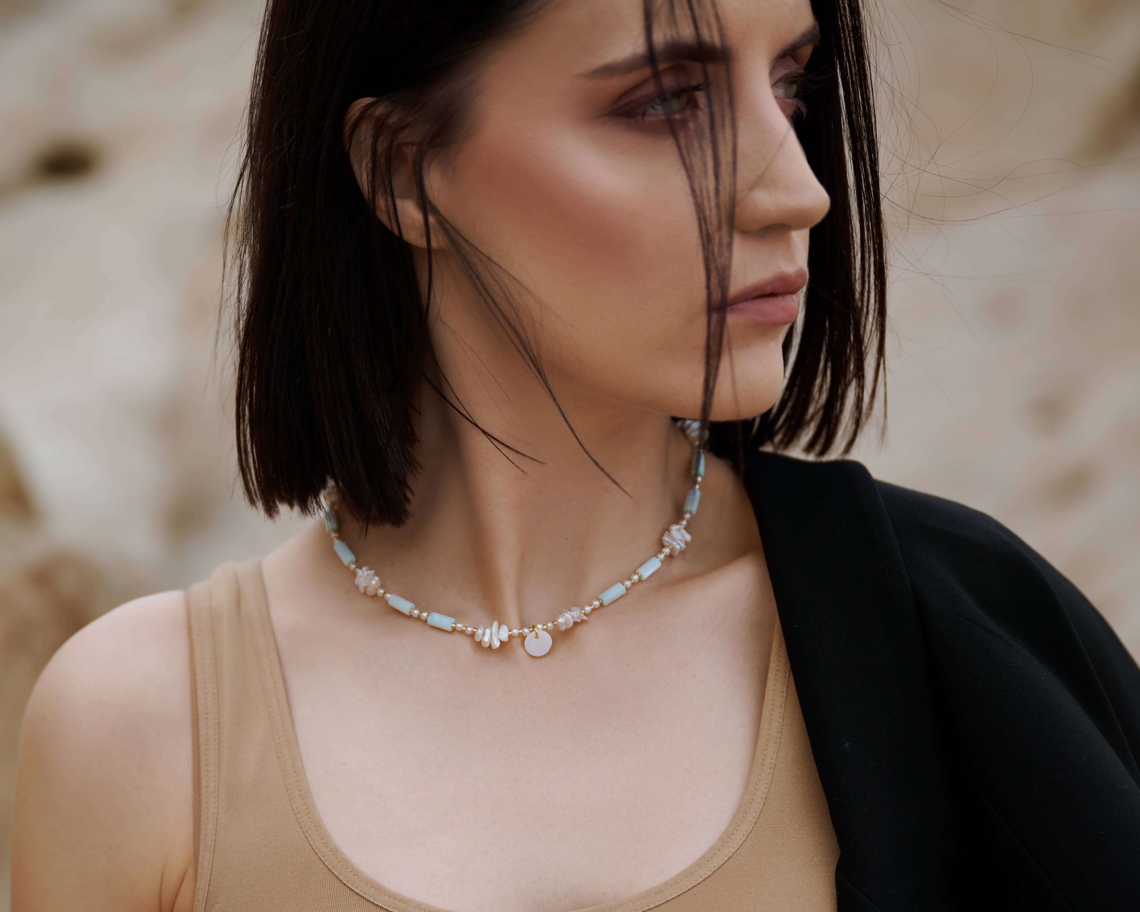 A delicate wave of pink for your seaside soul. The Pink Tide Necklace is a dreamy, beachy piece handcrafted with calming, coastal tones. This 16.5-inch necklace features soft pink and periwinkle sea sediment jasper heishi beads, glimmering faceted rose quartz briolettes, and a delicate freshwater pearl charm at the end of a 3-inch extender chain. Designed to sit gracefully at the collarbone, this necklace layers beautifully with gold chains or other coastal treasures. Finished with a gold plated lobster clasp and extender for adjustable wear, it's perfect for summer days, resort escapes, or simply bringing a bit of beachy bliss to everyday looks. Details: – 16.5" necklace with 3" extender (adjustable up to 19.5") – Pink & periwinkle sea sediment jasper heishi beads – Faceted rose quartz briolette beads – Freshwater pearl charm on extender – Gold plated lobster claw closure – Handmade with love A soft and sparkly shoreline for your neck.