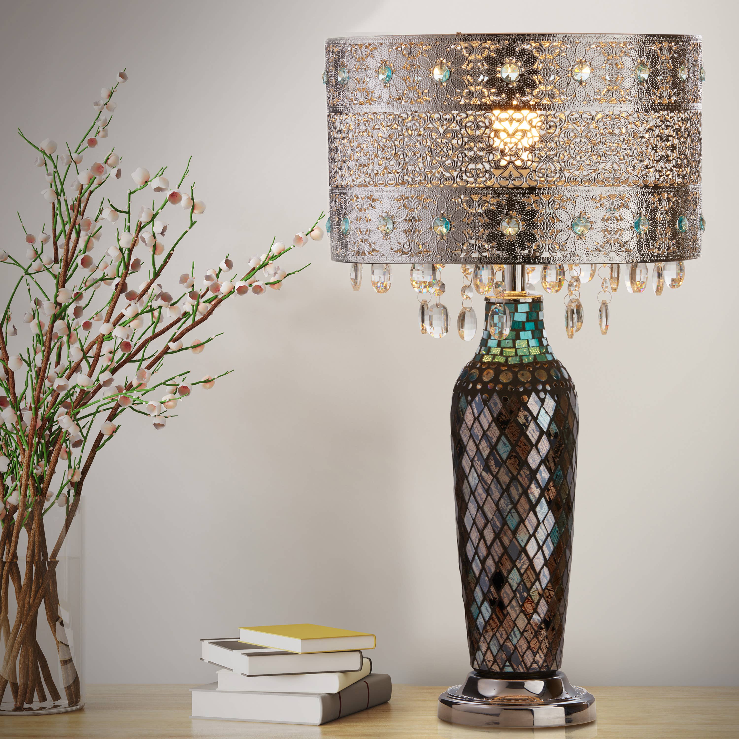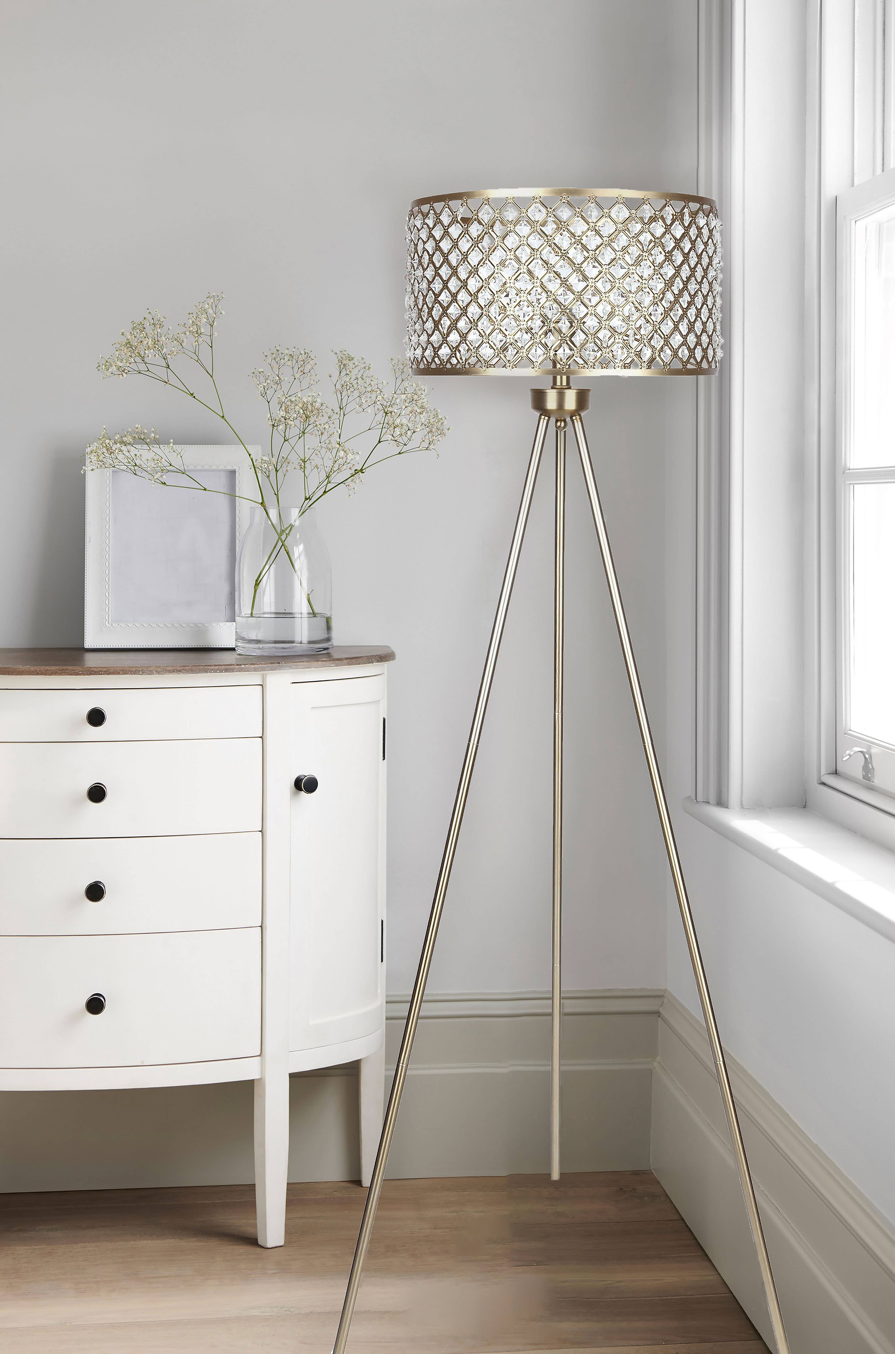 Add Bohemian flair to your entryway, living room or dining room with this 43.5"H Harley Silver & Crystal Floor Lamp from River of Goods. A silver-tone, matte-finished shade and nickel-tone fixture lend elegant and cohesive style to this floor lamp, while its eclectic, punched-metal design and crystal bead accents add textural interest. Compatible with LED lightbulbs, it features a plug-in design with a convenient foot switch and requires two 60W E26 bulbs (not included). Wherever you place it, this oversized, pillar-shaped lamp is sure to create the warm atmosphere you're looking for. Overall Dimensions: 11.5"L x 11.5"W x 43.5"H Punched metal design with crystal bead accents suits Bohemian or glam decor styles Metal and glass shade with matte silver finish and nickel-tone fixture for an elegant, cohesive look Thin, oval-shaped shade is 42.5"H and 11.5"W Plug-in design with convenient foot switch Requires two 60W E26 bulbs (not included) Wipe clean with a dry cloth