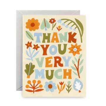Florals and one of my favorite color combos. A simple thank you with a classy feel. CARD DETAILS: Front of Card Text: "Thank You" Inside: Blank - awaiting your fab personal sentiment Size: A2 (US) - 4.25"x5.5" Printed in the USA Made from 100% PCW (post-consumer waste - aka. recycled material), 130# paper. The recycled material may have a few colored fibers in the card. Comes with a grey envelope made from some recycled content.