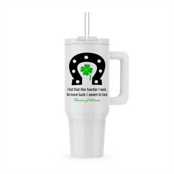 Irish-themed travel tumbler is decorated with a shamrock and the word: herself. Tumbler is 18/8 stainless steel inside and out; finished in white on the outside. Holds up to 20 ounces; keeps hot drinks hot and cold ones cold for hours. Clear lid includes silicone sealing ring and a sliding mechanism to easily cover or uncover the drink opening. To care for tumbler, hand wash only and do not use in microwave.