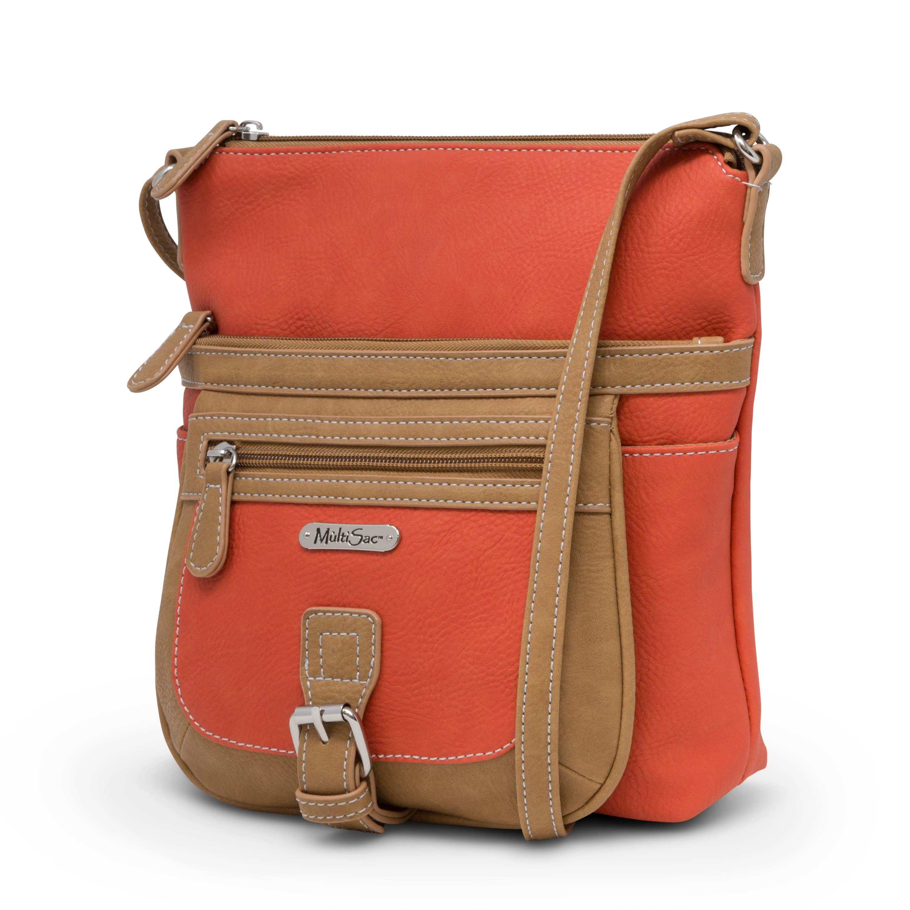 The MultiSac Flare women's crossbody purse is the only crossbody bag you will ever need to keep you organized. Each ladies crossbody purse includes: 2 zipper pockets, Shoulder strap drop 28", Adjustable shoulder strap, Top zip closure. This crossbody bag has interior features are organizational storage and a Back wall zip pocket. Not to big but with plenty of storage this vegan leather crossbody bag is the ideal travel bag with its organization and storage compartments. Size: 8" L x 5.5" H x 1.75" W