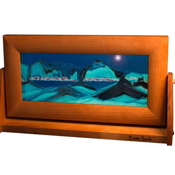 Moving sand pictures. The double-strength glass is framed with a quality black anodized metal frame. The black sand is heavier than the white sand so the two will never mix, some of the sands are transparent and some opaque giving the pictures a cool 3-d effect. Pictures may take from minutes to several hours to finish a magical landscape, tiny air bubbles hold up the sand creating unique natural scenes with every turn. Choosing the perfect gift for any occasion can be a delightful experience when you consider the recipient’s personality and interests. Exotic Sands make for a unique and thoughtful gift, capturing the beauty of shifting sands in a mesmerizing display. Whether you’re shopping for Christmas, birthdays, or any holiday, this artistic piece can be a perfect choice. Its ever-changing patterns can bring a sense of tranquility and wonder to any space, making it a memorable and cherished gift Size: 7" x 12".