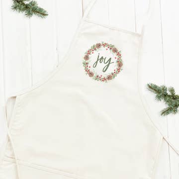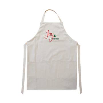 "JOY" Sweeten your holiday kitchen with this 100% cotton apron! With an adjustable neck strap and waist tie, this apron is perfect for most ages and sizes. It also features 2 front pockets - great for keeping baking utensils or grilling tools handy!