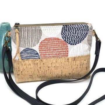 Mini crossbody with long, adjustable strap (50" at longest). All fabrics used are 100% certified organic cotton dyed with low impact dyes. Bag exterior made from natural cork on bottom, organic cotton on top with print designed by famed, mid-century artist Charley Harper. Bag strap made from organic cotton canvas. Zip top closure. Measures approximately 8.5" wide, 6.5" tall, and 1.5" deep. Soft, durable construction - interfacing used is 100% cotton. Handmade in Savannah, GA.