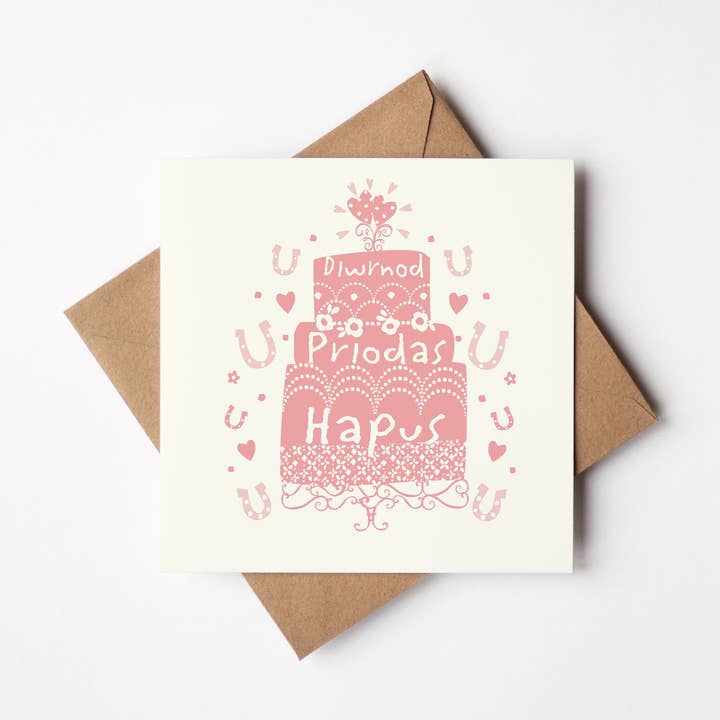 Priodas Hapus/Happy Wedding Day Heart 350gsm silk card Blank inside Recycled Kraft envelope Cello Bag Card Size 145mmx145mm