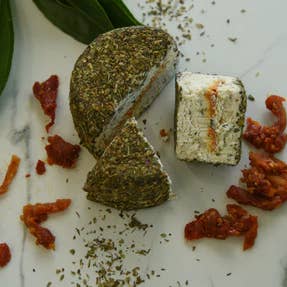 One of our top-selling cheeses. Our beloved "pizza cheese" has everyone talking! This unique fromage features a Mediterranean herb coating and a delightful surprise—a sun-dried tomato center. When we make this cheese, the entire building fills with the amazing aroma of Mediterranean seasonings. Allergens: Tree Nuts (Cashew, Coconut). Uses: Our Tomato Herb Fromage can be melted in a pan to turn into a decadent pasta sauce; add to Italian dishes for decadence and creaminess, or spread on sandwiches or veggie burgers for extra flavor.