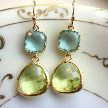 The peridot glass gems are 16k gold plated and measure approximately 13mm with 5mm at the thickest part. The aquamarine square blocks measure 9mm with 3mm thickness and are gold plated. The earwires are 14k gold filled. The length of the earrings is approximately 1.5 inches. These earrings are really dainty and pretty.
