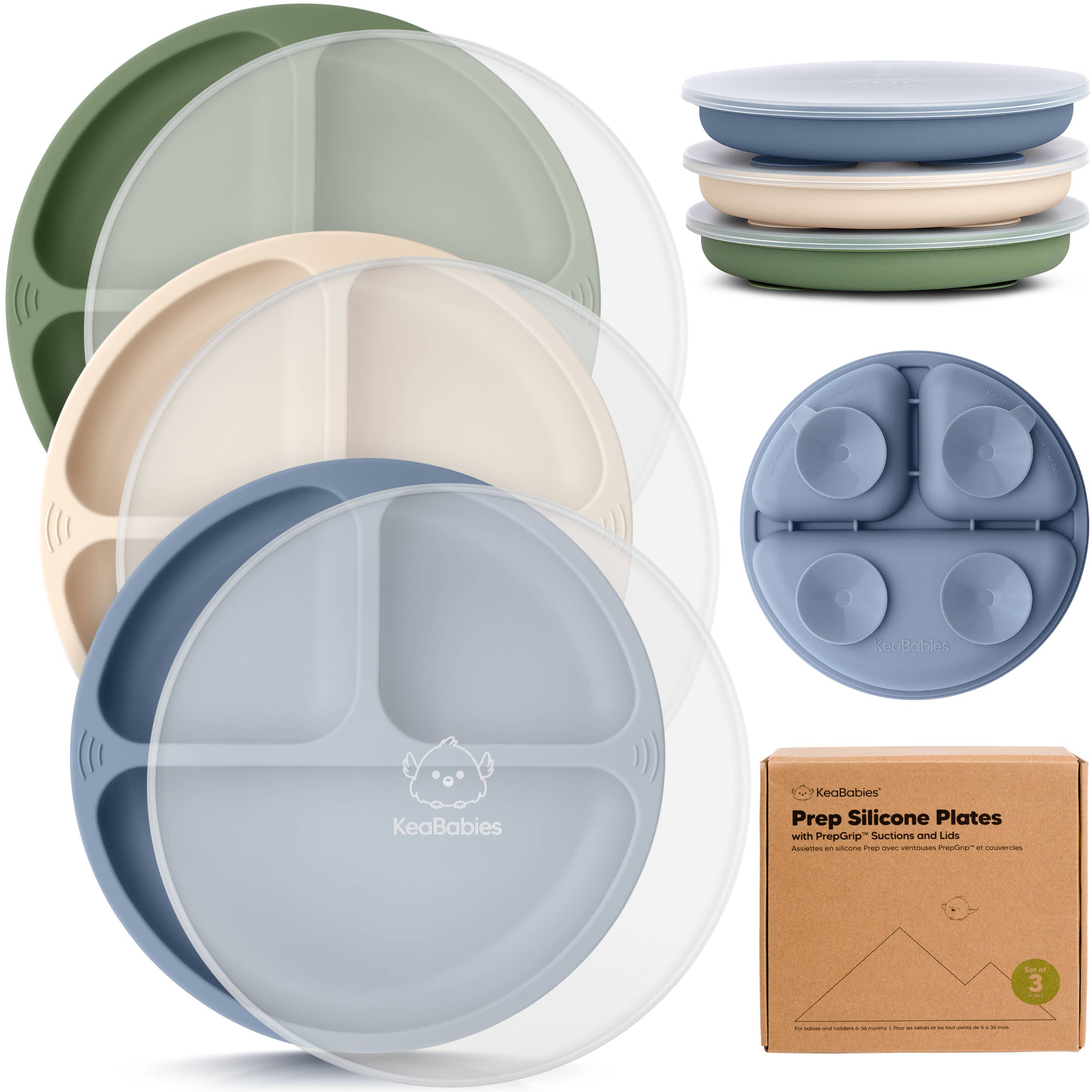 KeaBabies Prep Silicone Plates with lids are designed for enjoyable, independent and mess-free eating. Made from 100% food-grade silicone, these BPA-free kids plates are dishwasher-safe. The strong suctions keep baby plates securely attached to most high chairs tables. Easily remove by lifting tabs. - 3-pack toddler plates with lids doubles as baby food storage tray - BPA-free & Food-grade safe for microwave, dishwasher, and freezer - 4-point PrepGrip Suction with smart tabs for strong adherence and spill-free removal - Baby-Led weaning kids divided plates with fun design - Fit most high chair for mess-free & independent eating