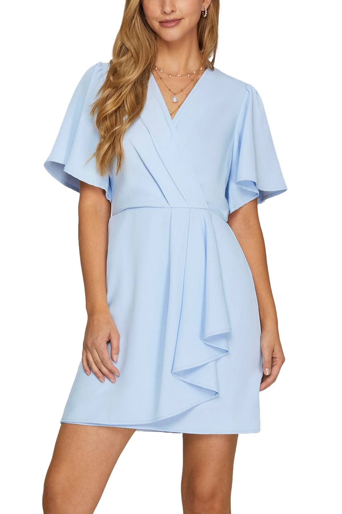 A smart and sophisticated dress that features a cowl neck, butterfly sleeves and ruffle side-skirt detail. Â Additional Details: - Unlined - Zippered Back - Care: Machine Wash Cold Crepe (96% Polyester, 4% Spandex) Style: 95783M