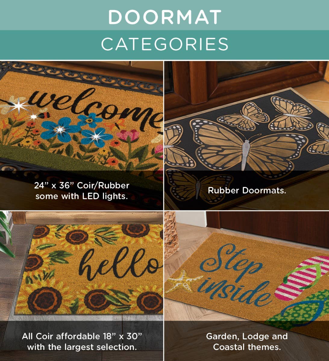 Regal Doormats feature superior style with everyday function. We offer a much thicker natural coconut fiber for a richer look, more comfortable step and a longer life. The bounty of the harvest welcomes visitors here with pumpkins and colorful Fall leaves.