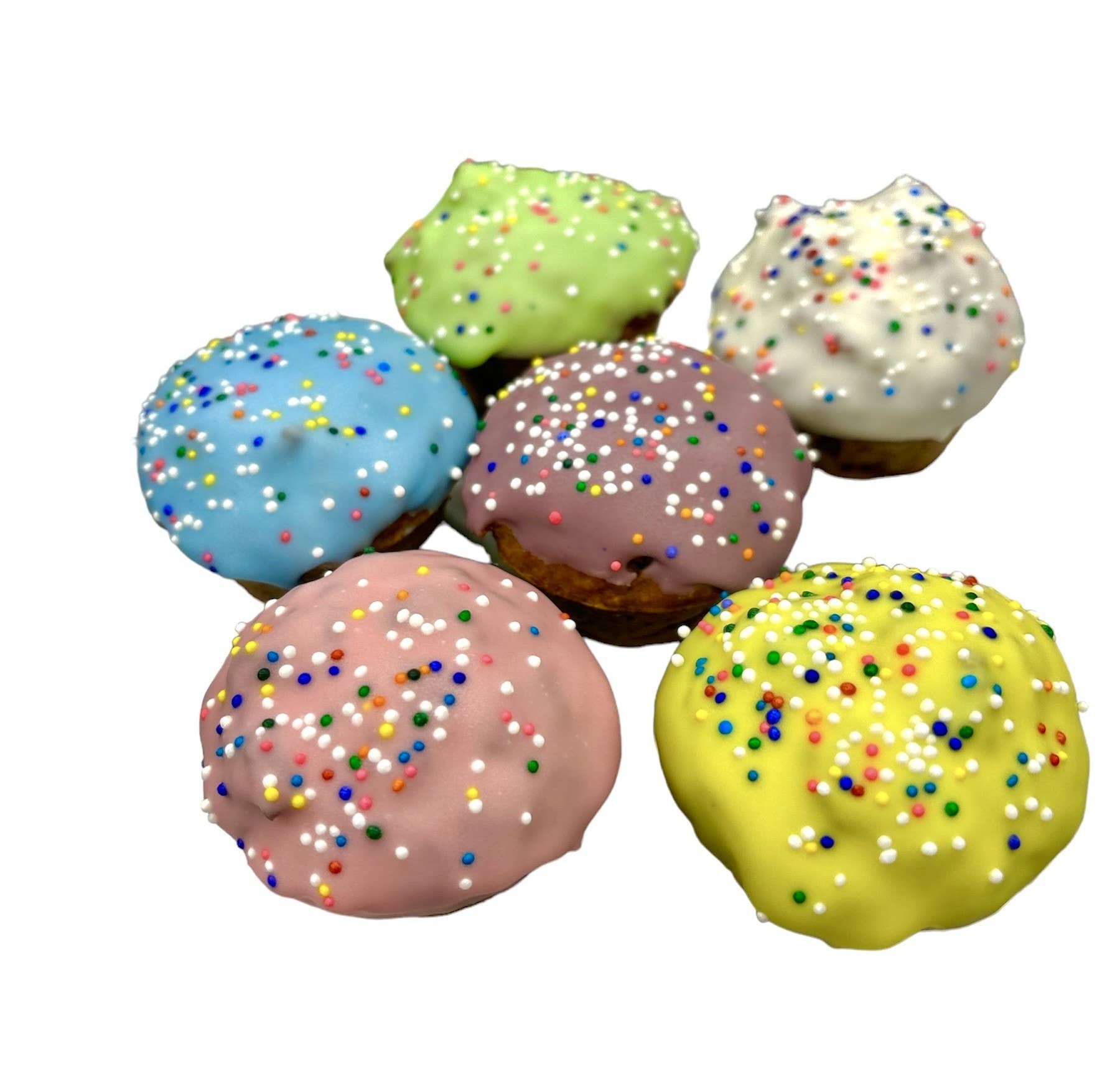 Available year-round in six colors... blue, green, pink, purple, yellow (the same colors as our birthday bones), and white. Each cake is decorated with the words "Happy Birthday" and a pawprint or two. each banana cake is 7" long x 4" wide and comes in a white pastry box with a clear oval top window. Shelf life is 8 to 9 months. The texture is dense and will remain "cake-like" for up to 3 months. Do not refrigerate, but freezing will extend product life. Cake ingredients: Banana puree, honey, rolled oats, rye flour, rice flour, coconut oil, molasses, eggs, cinnamon, vanilla, baking soda, and rosemary extract. Decoration ingredients: Sugar, palm kernel and palm oil, natural flavor, sunflower lecithin, salt, carob powder, turmeric, fruit and vegetable juice for color. Guaranteed analysis: Crude protein (min): 6.0% crude fiber (max): 1.5% Crude fat (min): 23.8% Moisture (max): 9.5% Calorie content (me calculated): 4277 kcal/kg (727 kcal/cake).