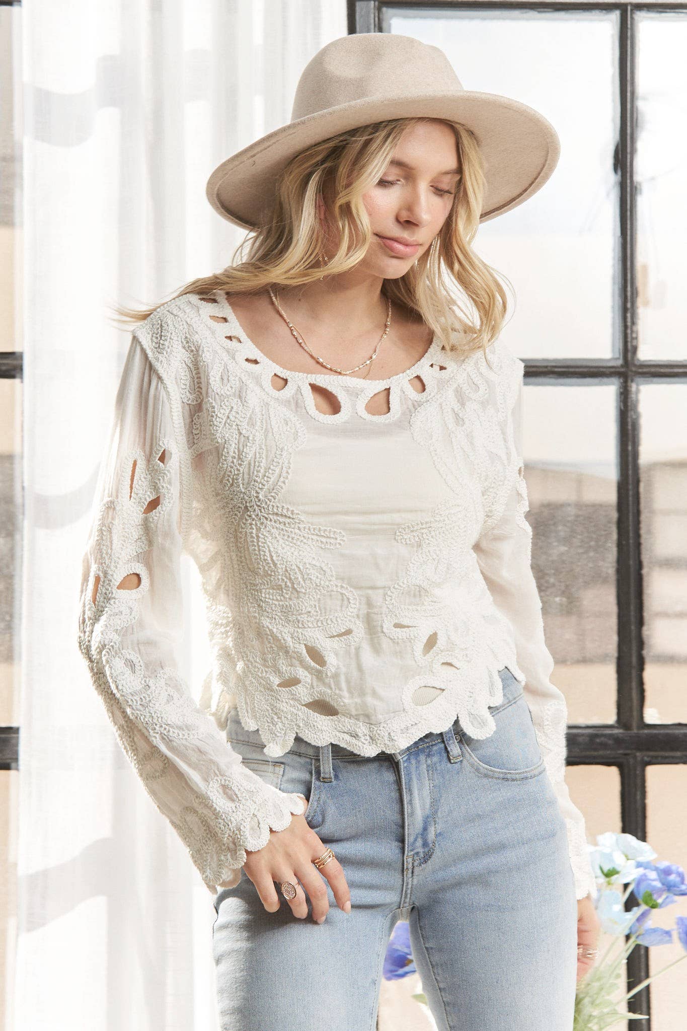 3/4 BELL SLEEVES LACE BLOUSE WITH SCALLOP EDGE 100% COTTON MADE IN CHINA *Bell sleeves *Lace *Scallop hem Actual product color may vary from the images shown. Every monitor or mobile display has a different capability to display colors, and every individual may see these colors differently.