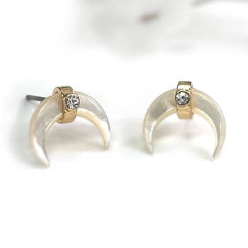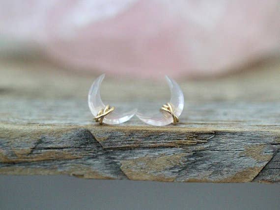 These gorgeous studs are bound to become your favorites! Natural Crystal Quartz gemstones have been custom cut into modern faceted crescent moons, and securely wrapped into place in my original style to create a unique and edgy pair of studs you'll love wearing. The stones can be worn in your first ear piercings, or your second if you prefer an ear climber look! Models are wearing the same studs in Mother Of Pearl, for size reference