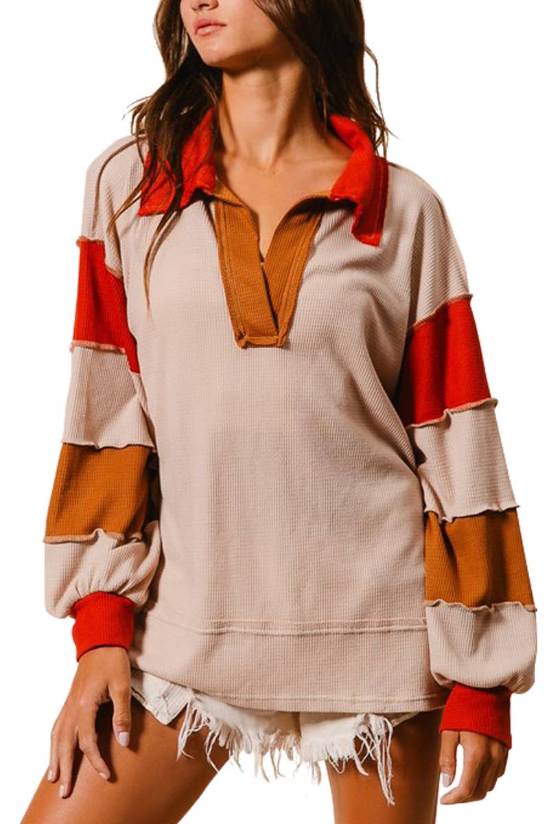 French Terry Color-block Collared Loose Fit Top - Big collar - Henley style - Long dolman sleeves - Contrast color block details - Raw edge details - Over sized