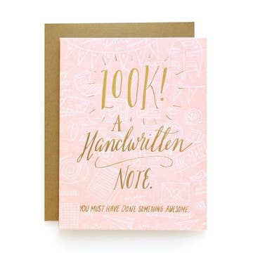 Look! A handwritten note. You must have done something awesome. From our new collection featuring foil-stamped text over a flood of color. • Card size is A2 (4.25"x5.5") • 100% recycled card stock • Blank inside • Letterpress printed in Chico, California
