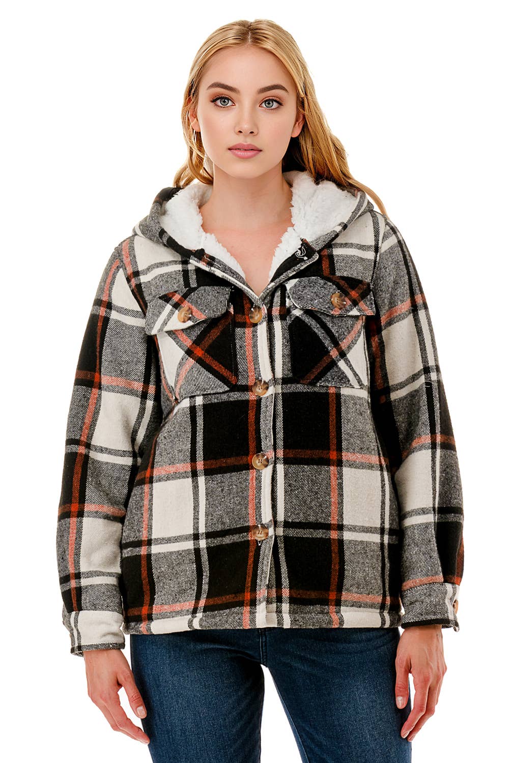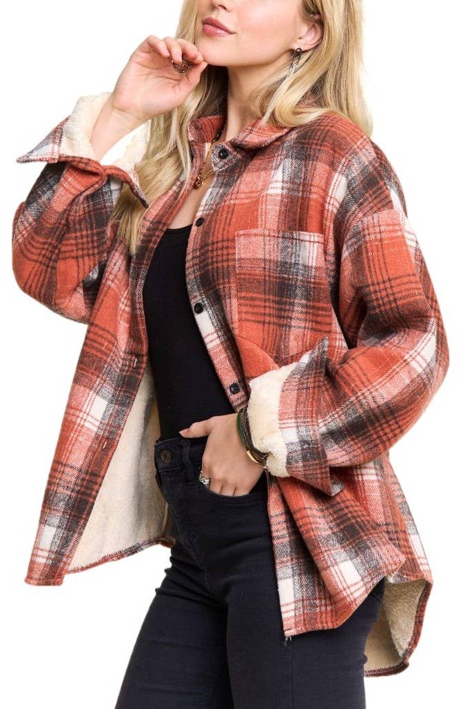 PLUS FUZZY MULTI PLAID BUTTON FRONT SHIRT JACKET MIX MATCH WITH FUR COLLAR SEPARATELY 100% POLYESTER Model is wearing Small Height: 5'9" Bust : 32B Waist : 24" Hips : 34"